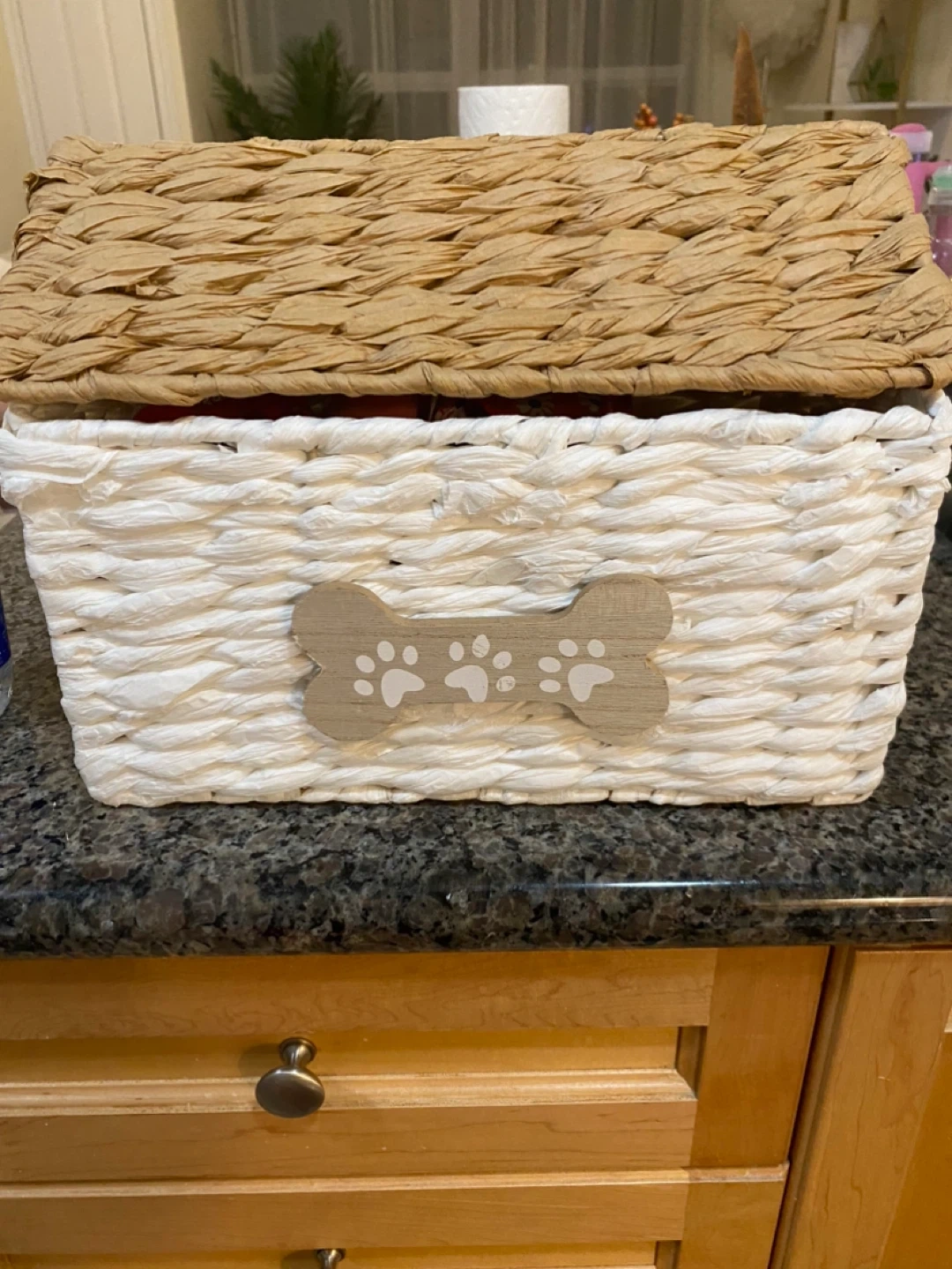 10Selling a cute woven basket for storing pet toys! It has a lid and a bone-shaped decoration with paw prints on the front. Perfect for keeping your pet's toys organized and out of sight