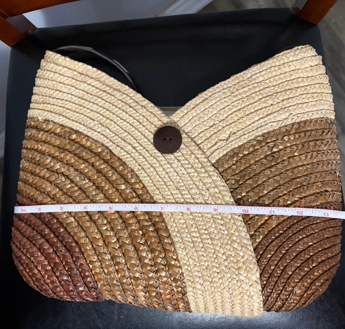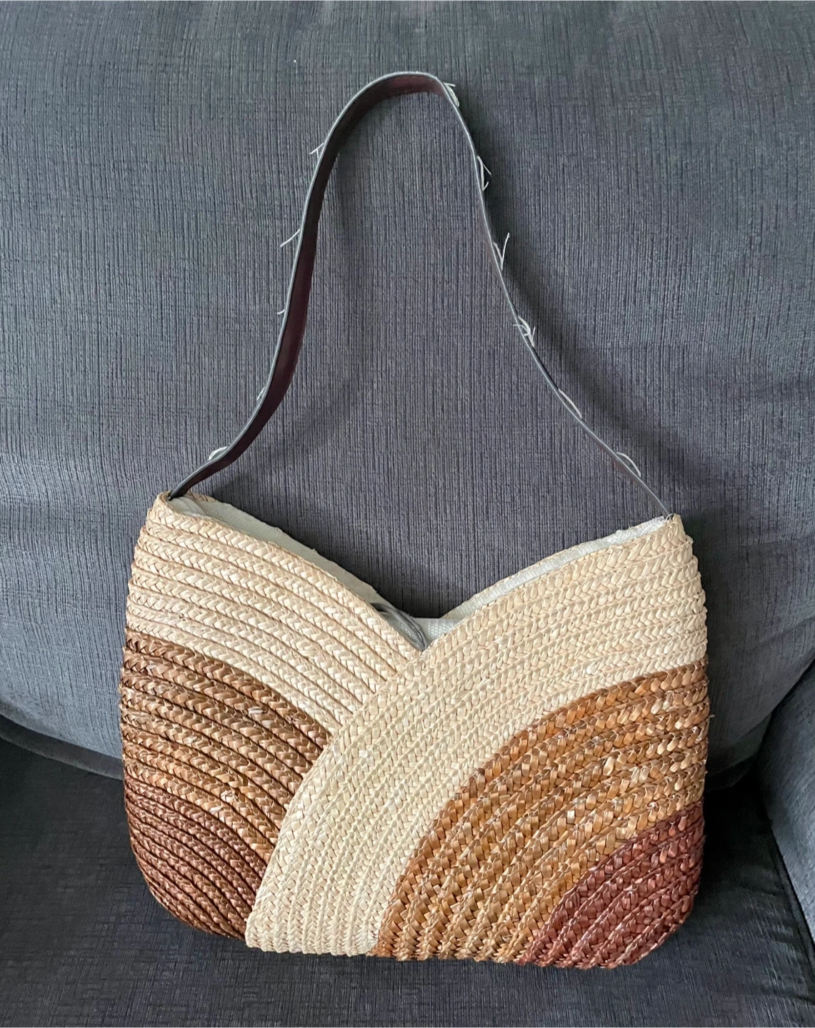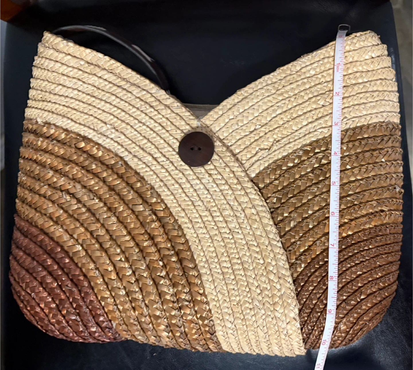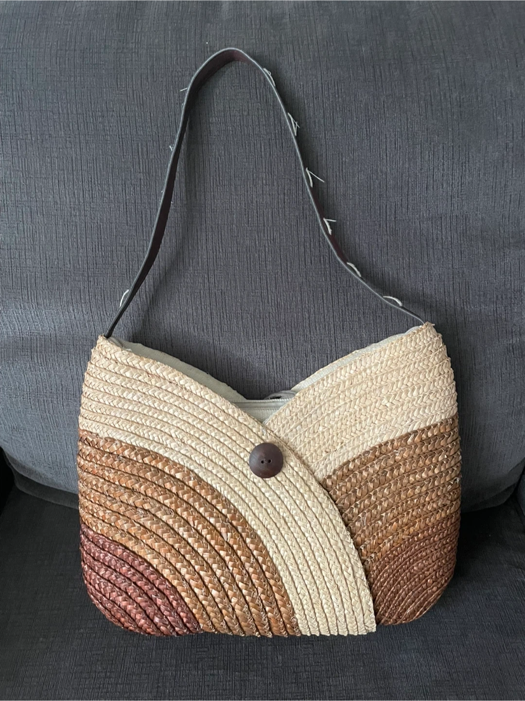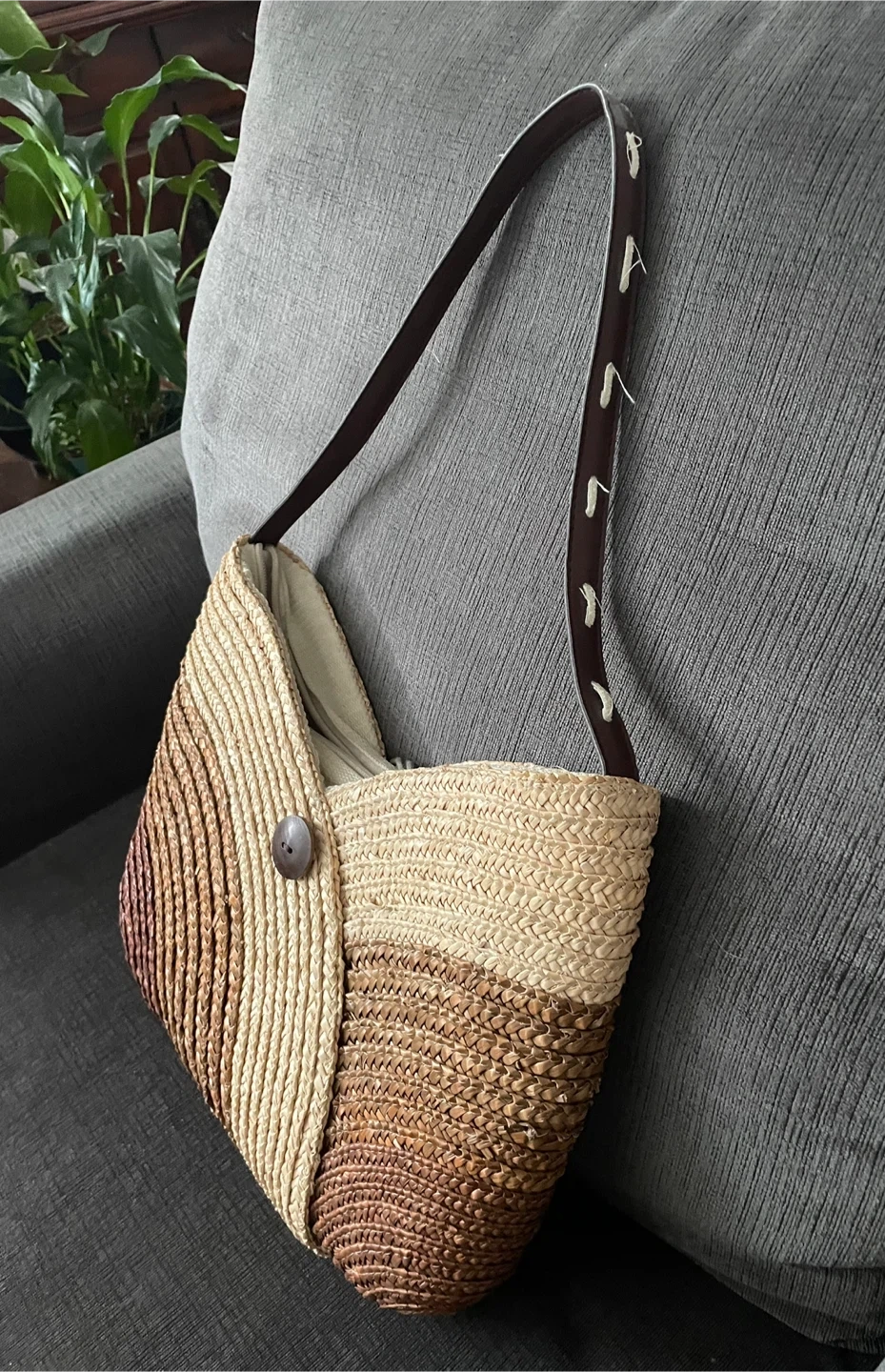 60This is a cute woven straw shoulder bag! It features a brown shoulder strap and a button closure. Perfect for summer!