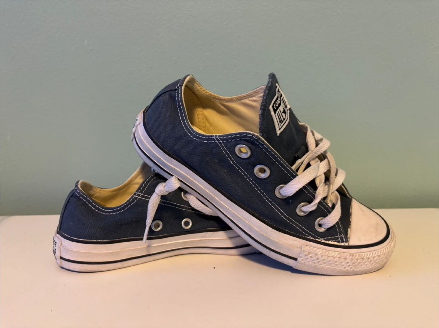 Classic navy blue Converse All Star low top sneakers. These shoes feature the iconic Chuck Taylor design with a rubber toe cap and white laces. Made with canvas uppers and a rubber sole.