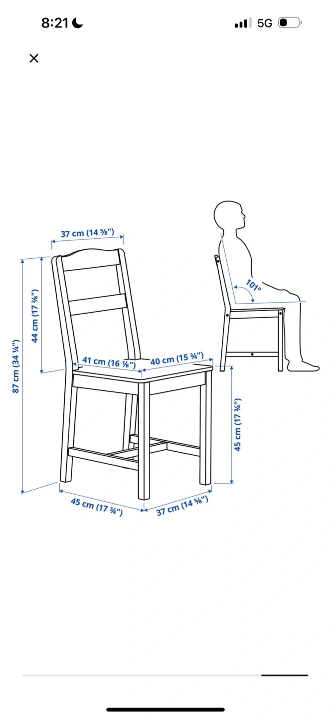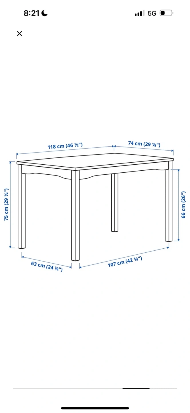 This is a wooden dining table with four chairs. The table measures 118 cm by 74 cm. Each chair has a seat width of 41 cm and a total height of 87 cm. It's a classic design perfect for family meals.