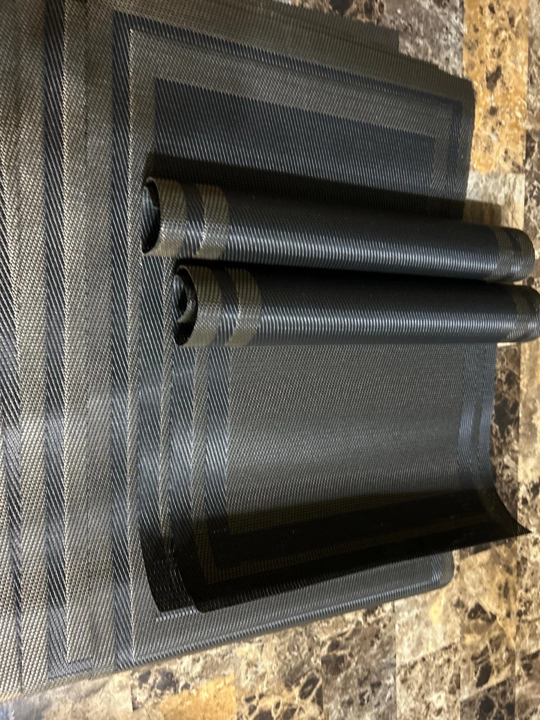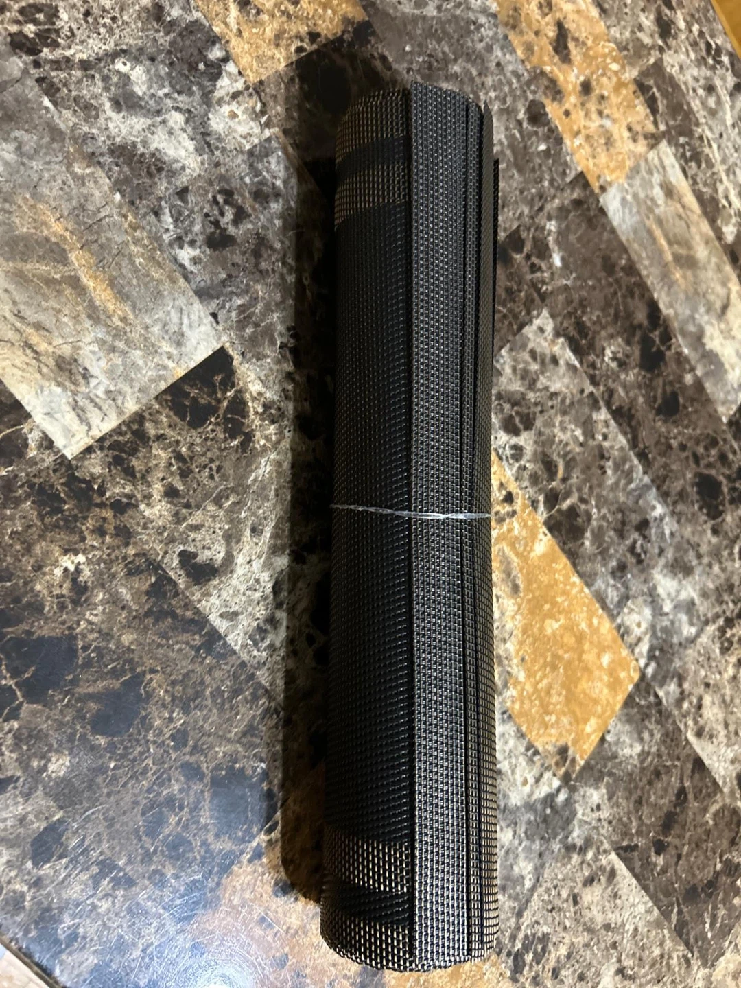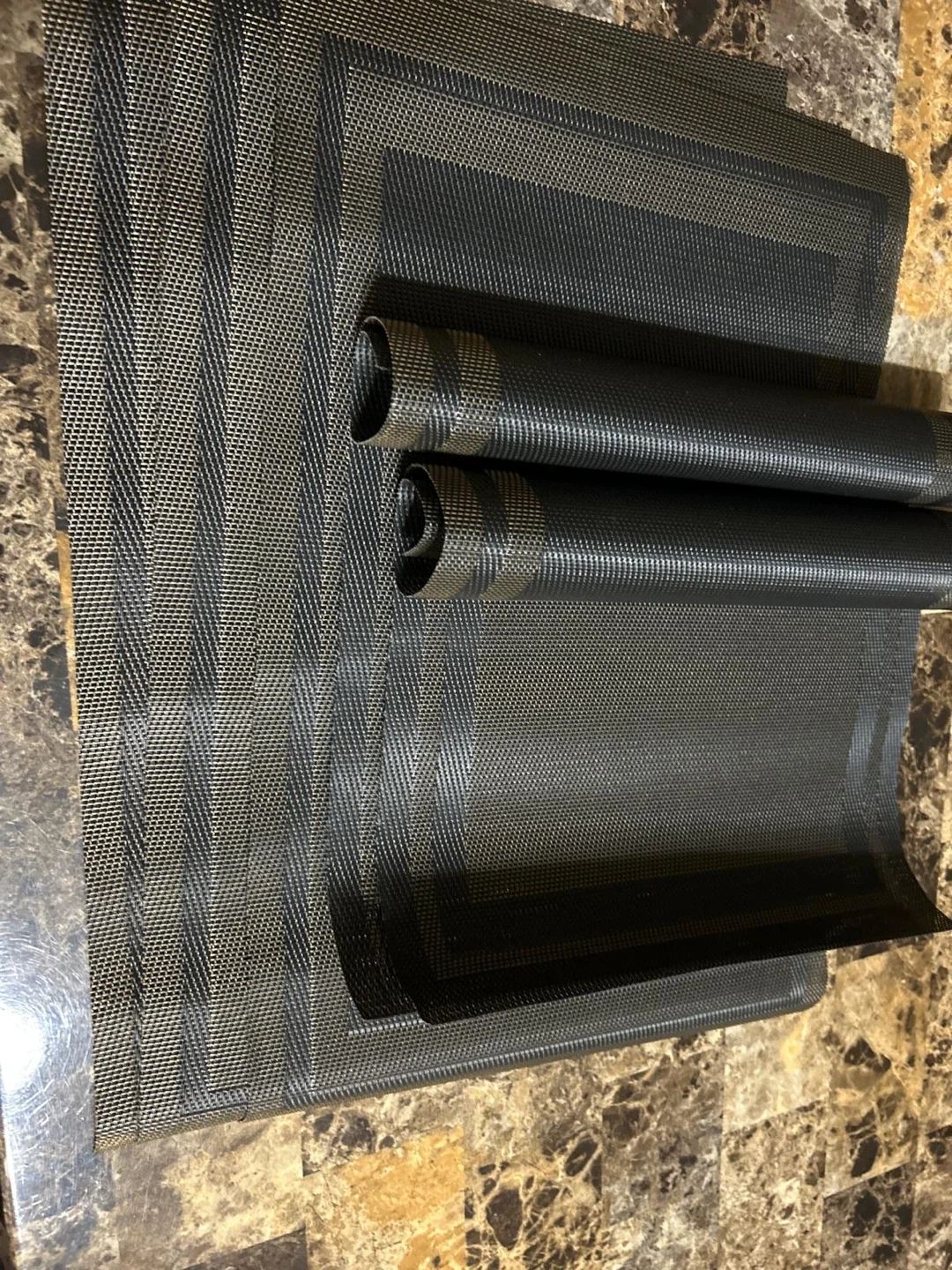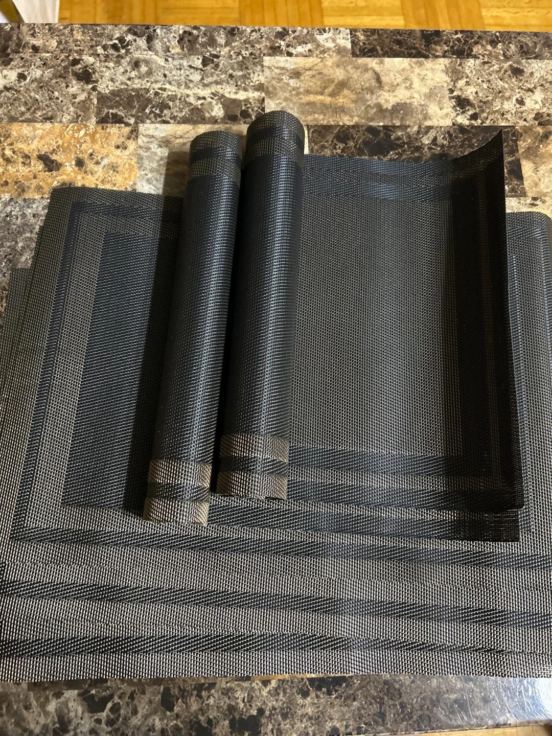 These new placemats are black and gold and have a woven texture. They're durable and easy to wipe clean. They'll protect your table from spills and scratches. When not in use, they can be rolled up for convenient storage.