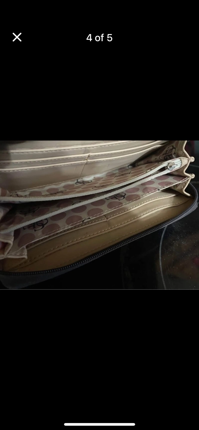 Brown GUESS purse and matching wallet. Beige accents. Zipper closures. Multiple compartments. Great for everyday use.