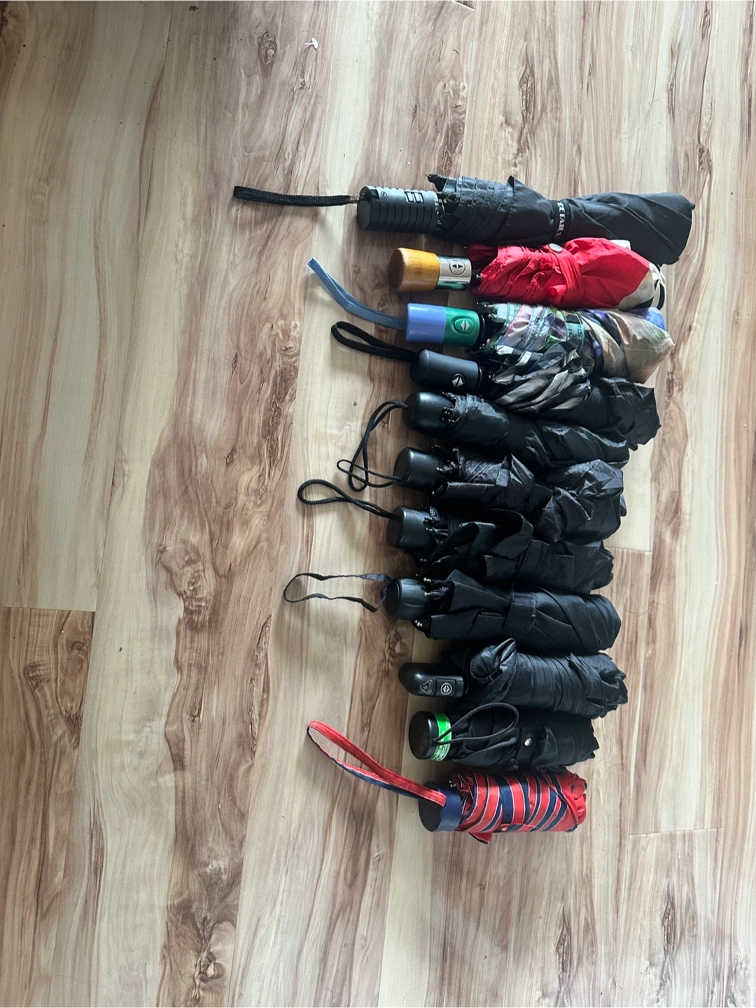 A collection of ten compact umbrellas, perfect for keeping in your car or bag for unexpected rain showers. Most are black, with a few assorted colours and patterns visible. They're all foldable and portable.