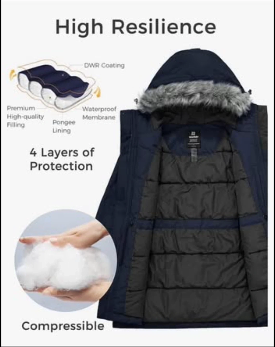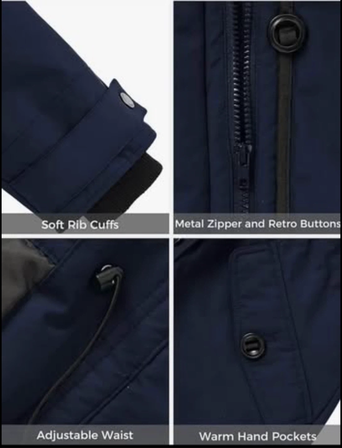 Stay warm in this navy blue parka. It features soft rib cuffs, metal zipper, retro buttons, and adjustable waist for a great fit. The jacket also has warm hand pockets. It's designed with 4 layers of protection, premium filling, and a waterproof membrane. This parka is compressibly warm and stylish for cold weather!