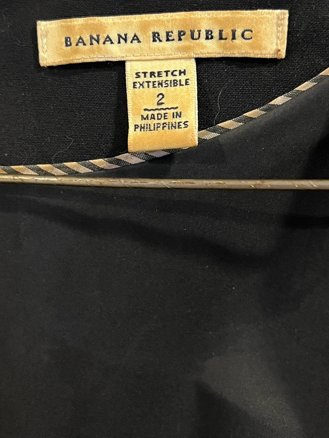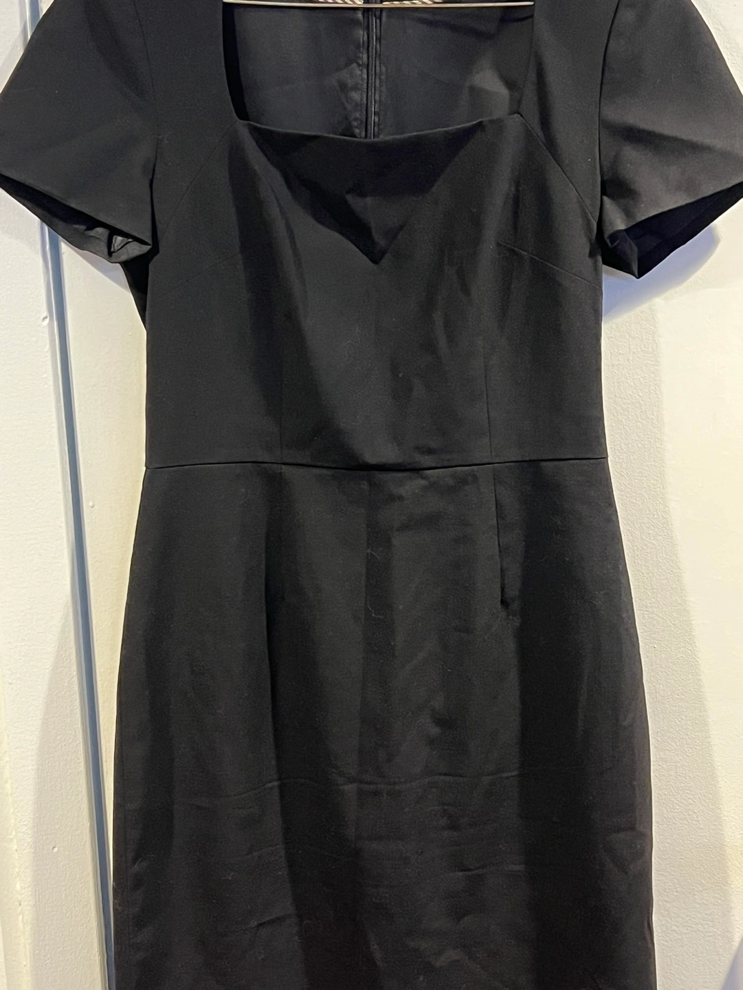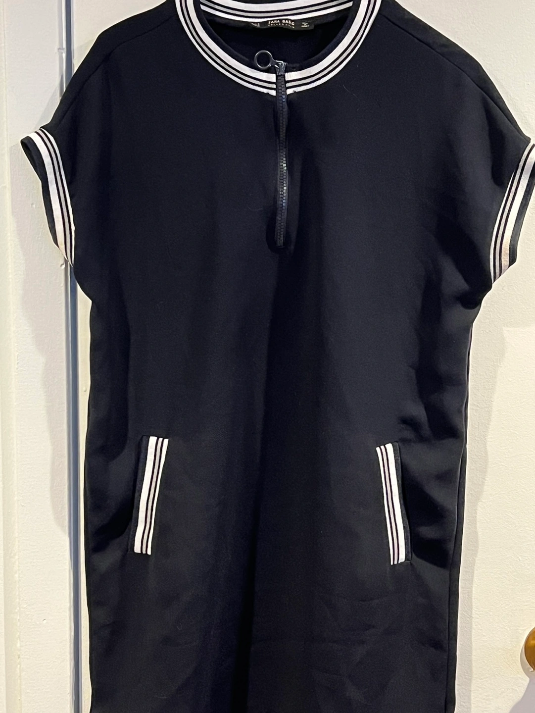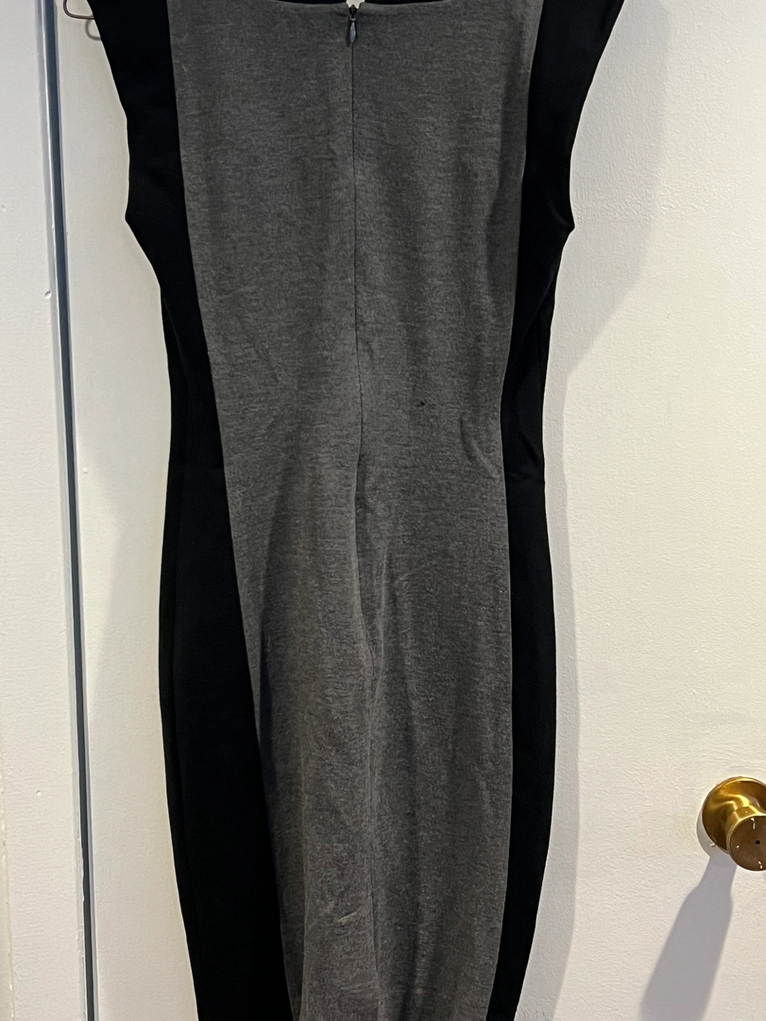 Four dresses, various styles and sizes. Two black Banana Republic dresses, one with short sleeves, the other sleeveless. One black Zara Basic Collection zip-up dress, and one two-tone grey and black Banana Republic dress. Great for work or casual wear.
