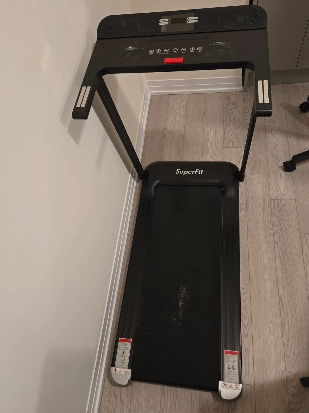 Selling a SuperFit folding treadmill in black. It's in great condition and perfect for small spaces. Folds up easily for storage when not in use. Get your steps in at home!
