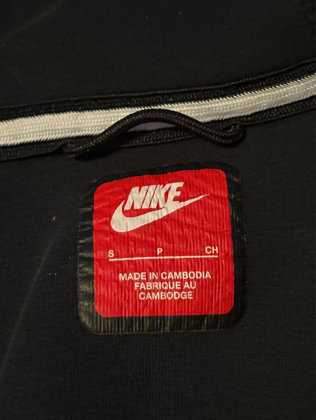 Black Nike Tech Fleece full zip hoodie. Made in Cambodia. Size S. Features zippered pockets and a hood.