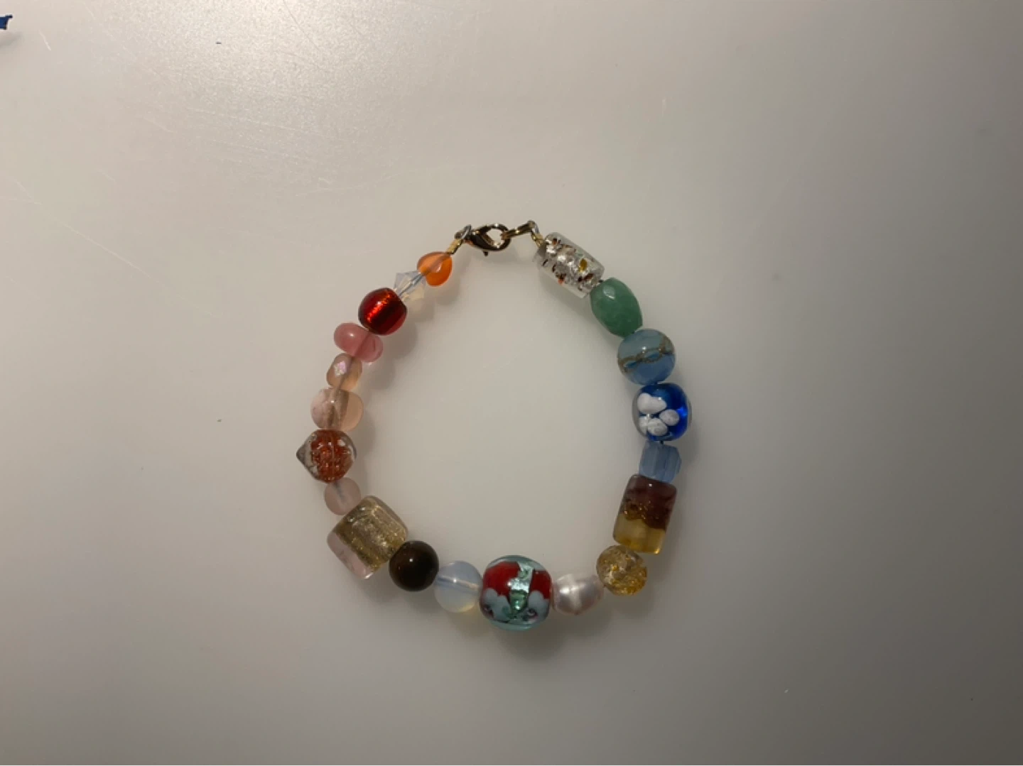 A colourful beaded bracelet. It's made with a variety of real jewel ๐ and stone beads. Comes with a sheer blue drawstring pouch for storage. It took 20dollars and I never used before!