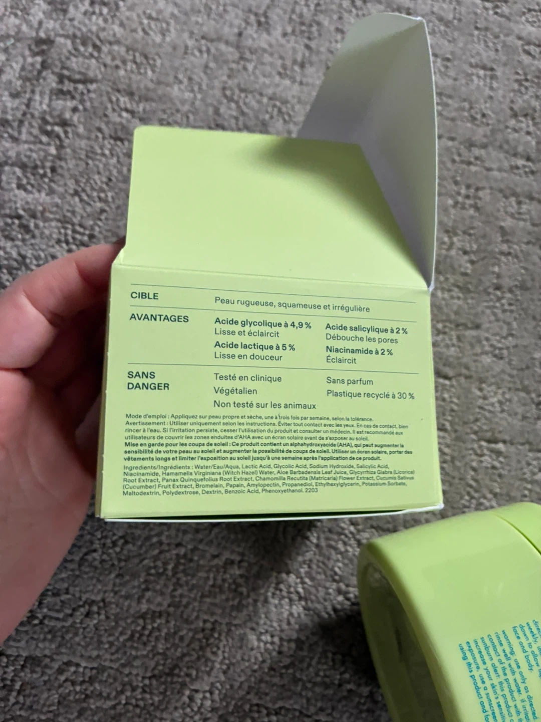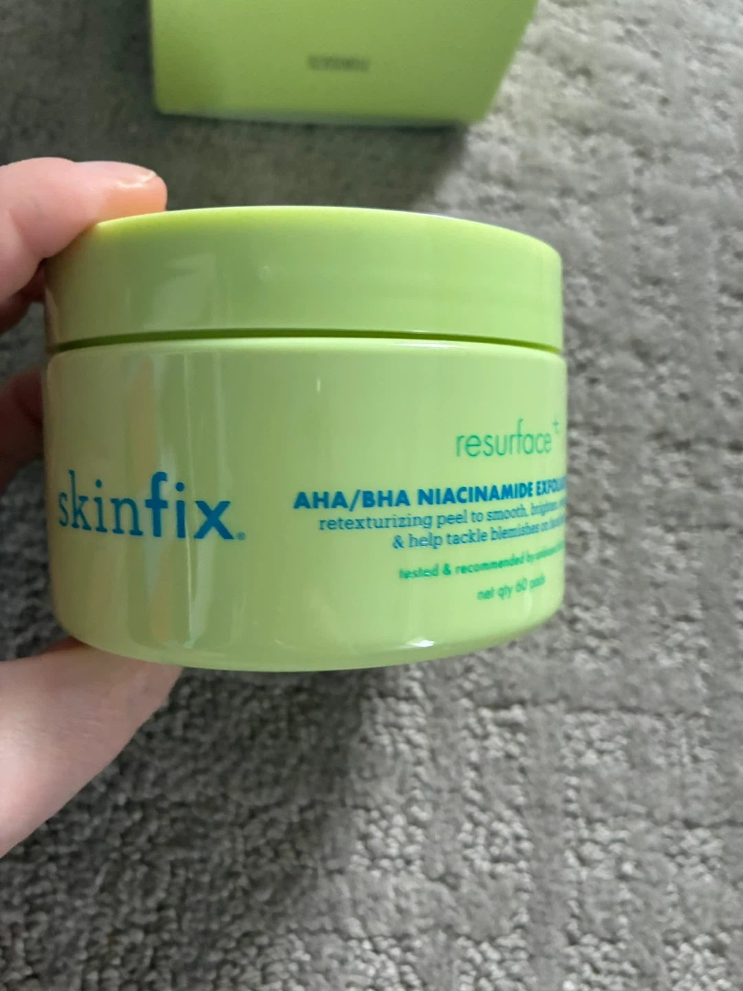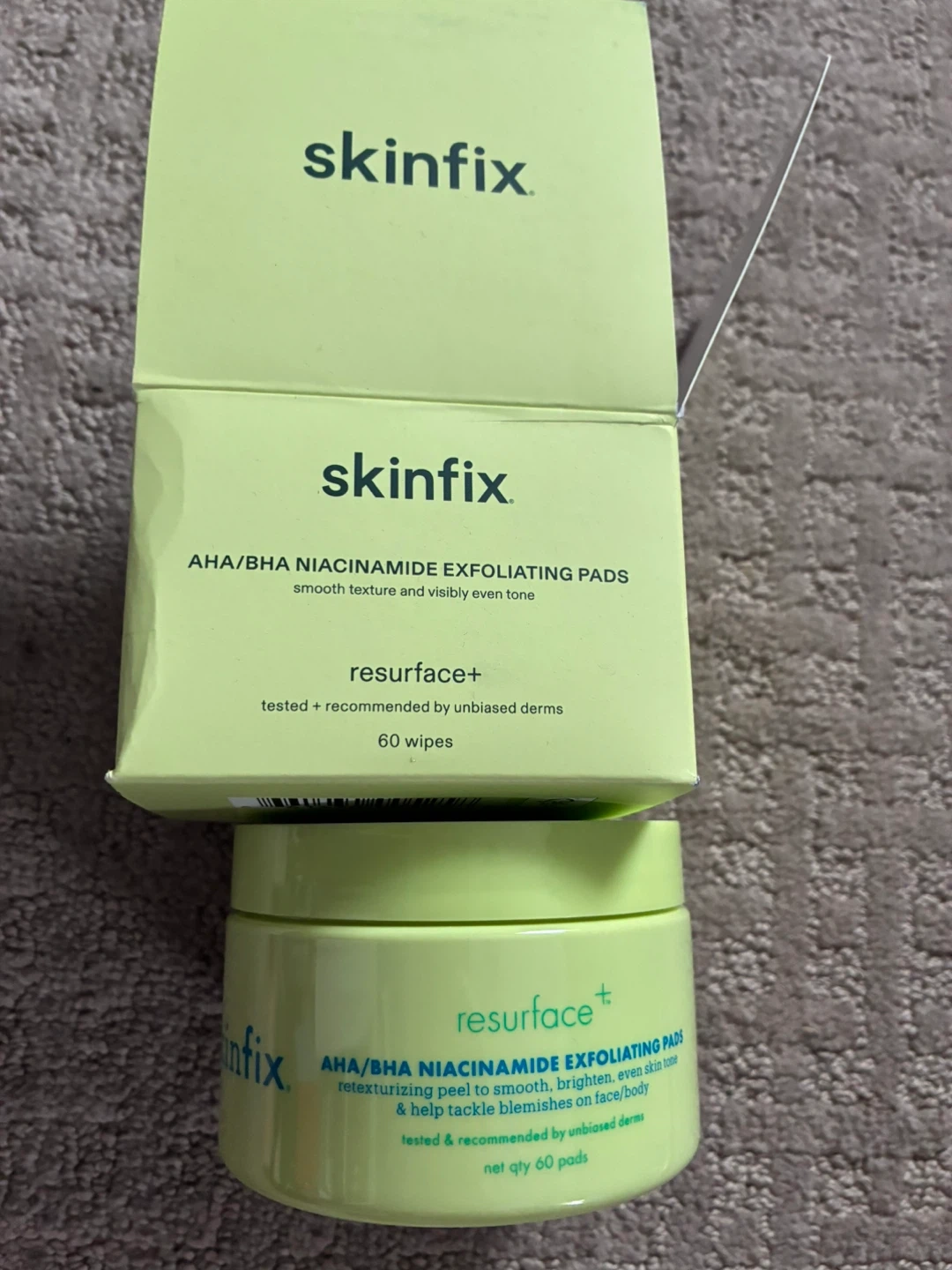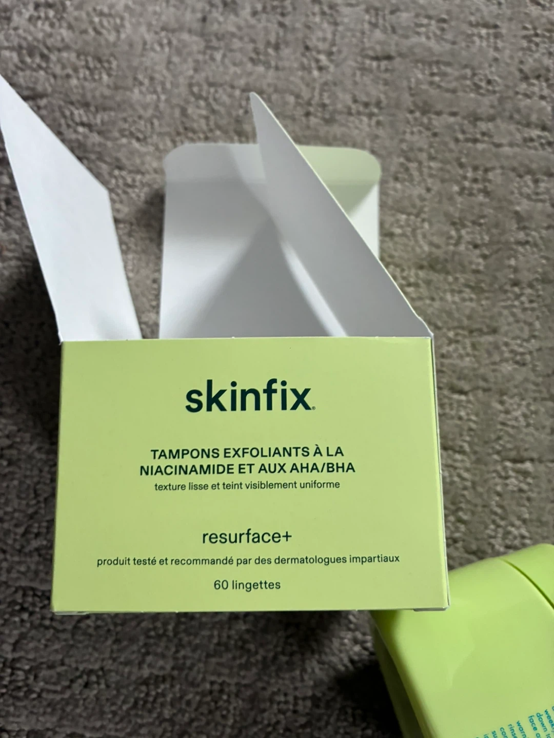Skinfix resurface+ AHA/BHA Niacinamide Exfoliating Pads for smooth, bright skin. Contains 4.9% Glycolic Acid, 5% Lactic Acid, 2% Salicylic Acid, and 2% Niacinamide. Clinically tested and vegan. Made in Canada with globally sourced ingredients.