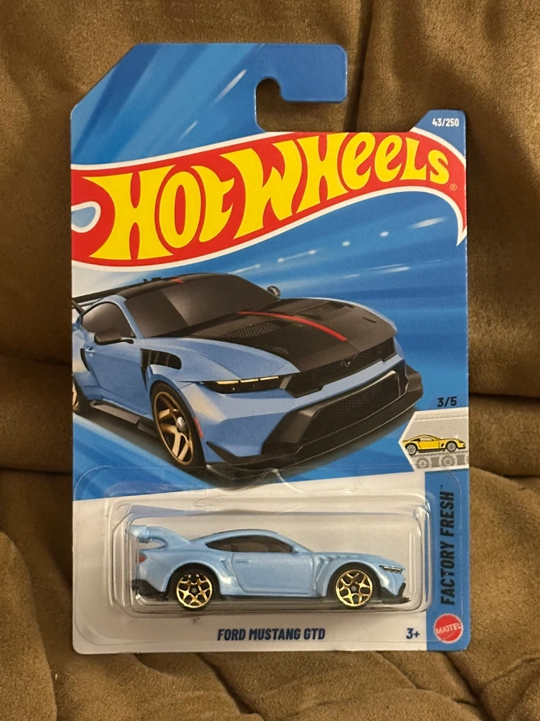 This is a Hot Wheels 2025 Ford Mustang GTD die-cast toy car. It's part of the 60 Years series. The car is a 1:64 scale model. Suitable for ages 3 and up.