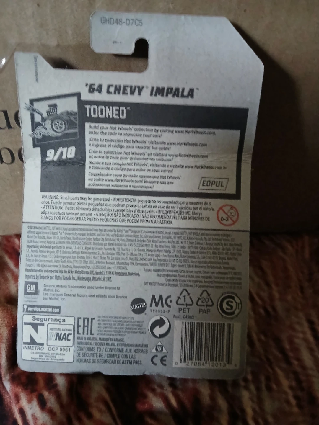 This is a Hot Wheels '64 Chevy Impala Tooned diecast car. It's a 9/10 in the collection. Small parts are included, so it's not recommended for children under 3 years.