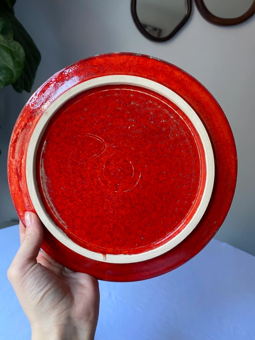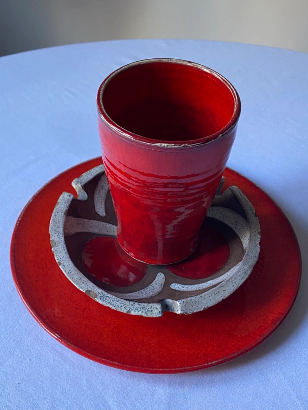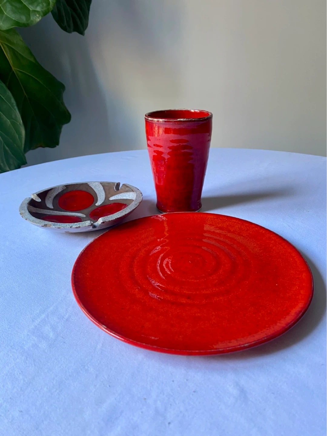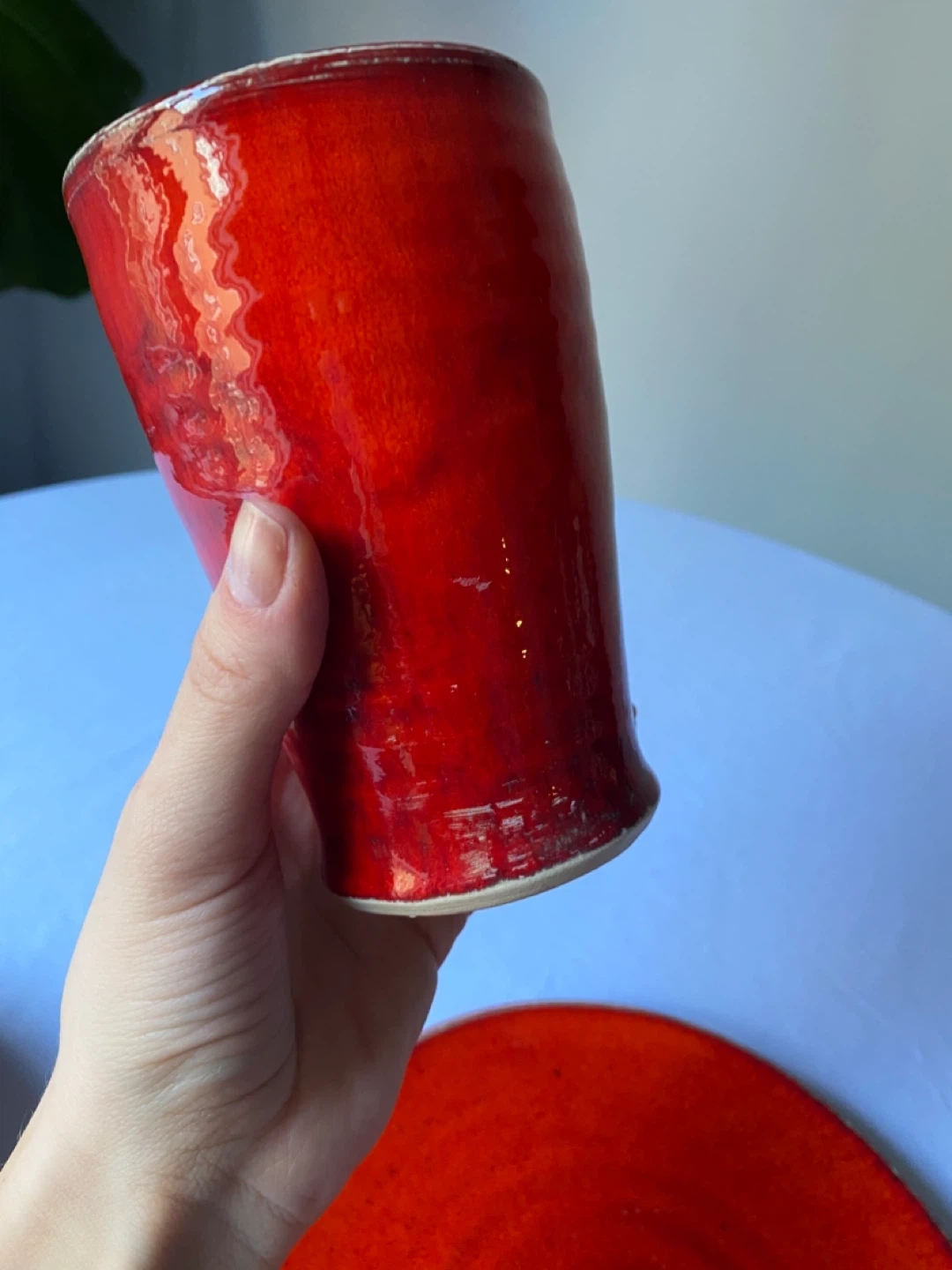 Fire engine red, obsidian, and toasted almond. Heavyweight glazed stoneware.