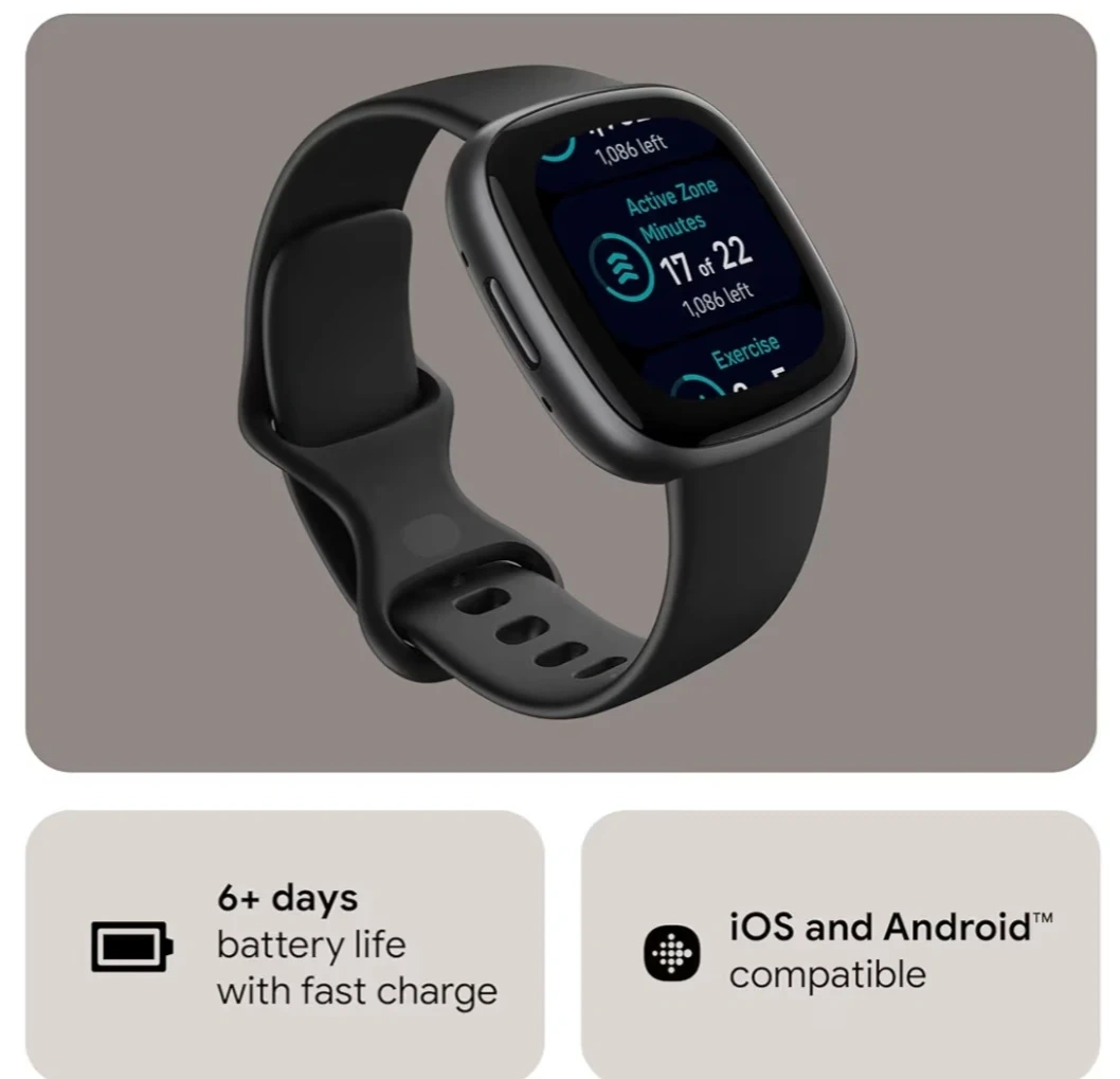 Selling a Fitbit Versa 4 fitness smartwatch tracks your daily readiness, GPS, and heart rate. It comes with 40+ exercise modes, sleep tracking, and is compatible with iOS and Android. Battery life lasts over 6 days with fast charge and includes a charger.