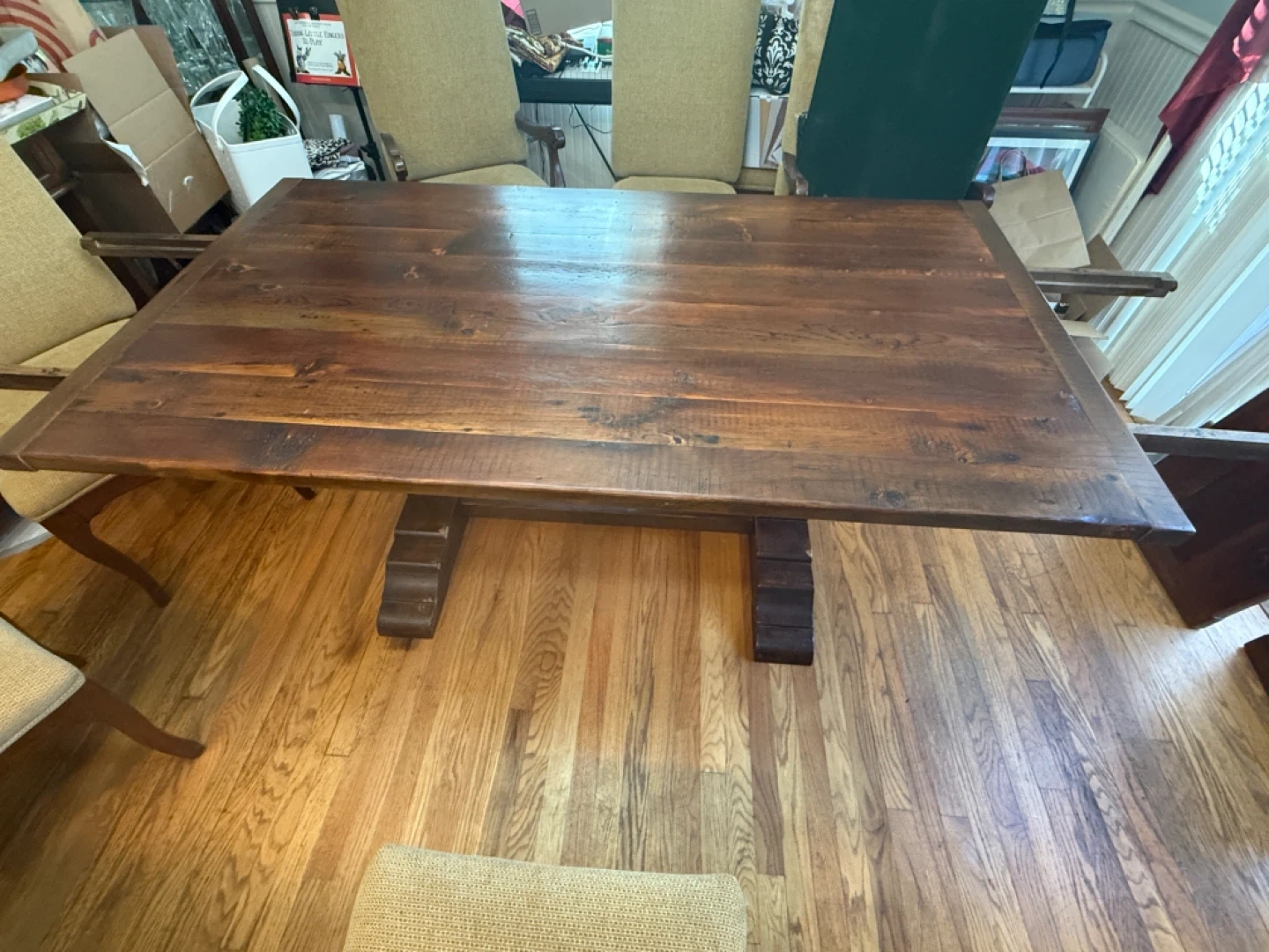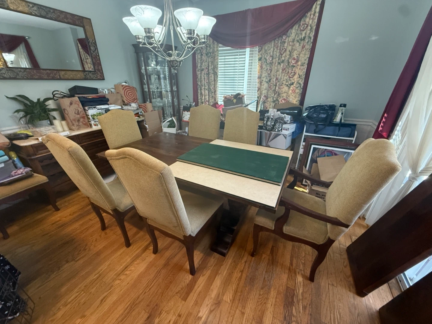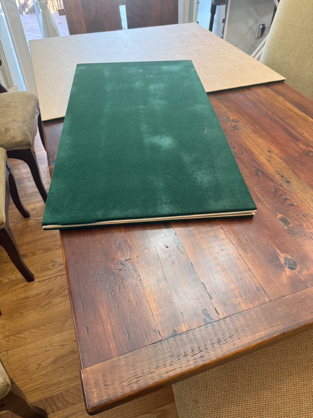 Selling a dining table, which includes a leaf to extend the table's length. It also comes with a green protective cover for the table's surface.