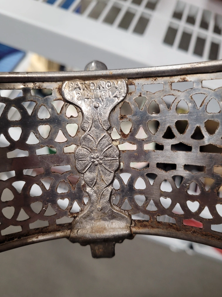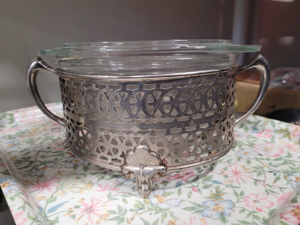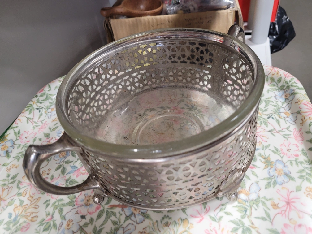 nice serving dish cradle. 1914 patient on this cradle. Ornate silver-plated bowl featuring an intricate pierced design. Glass insert included. Two handles. Footed base. Unique vintage piece.