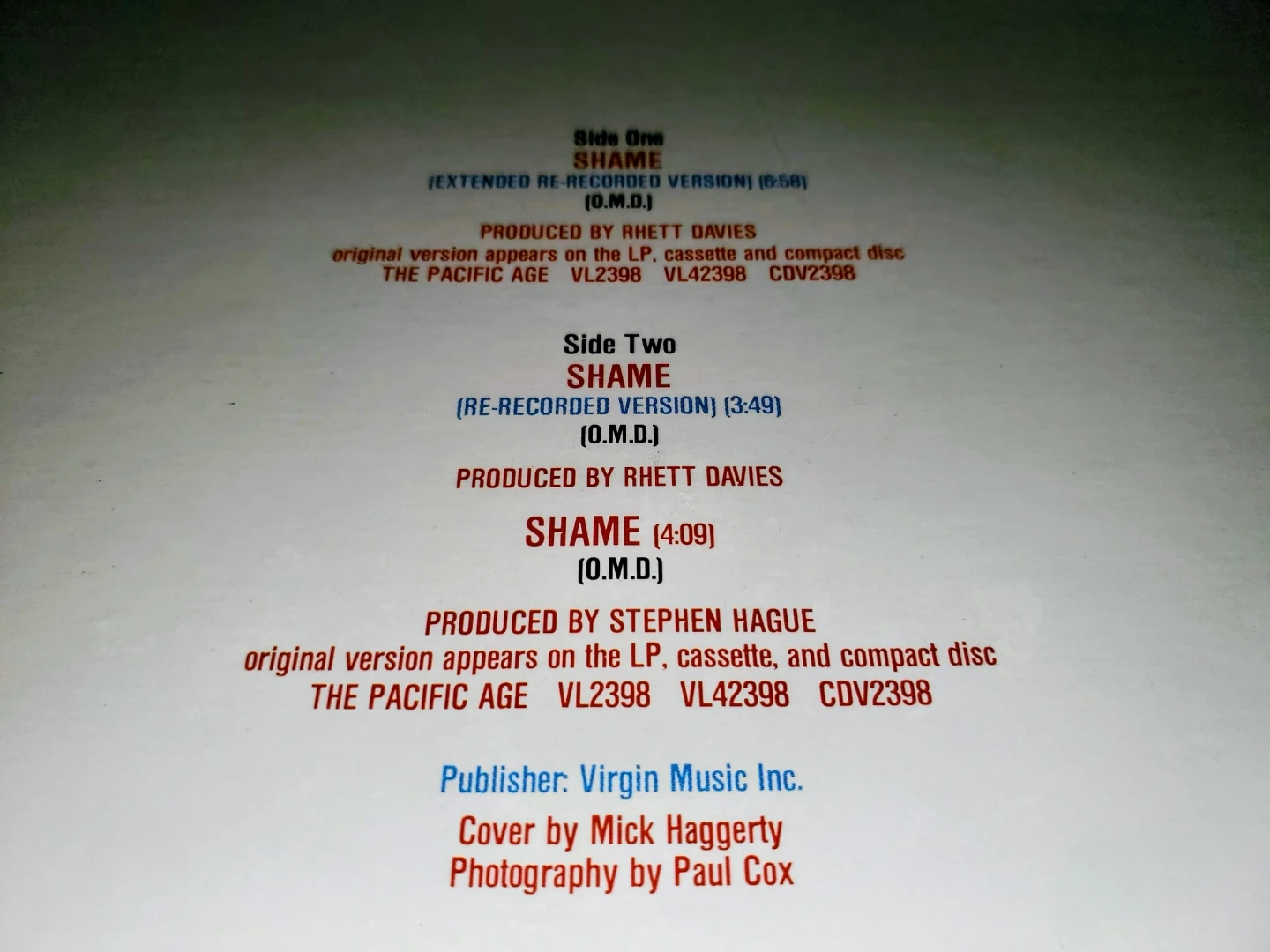 It includes the extended re-recorded version on Side One and the re-recorded version and original version on Side Two. Manufactured in Canada by Virgin Records Canada Inc. in 1987.