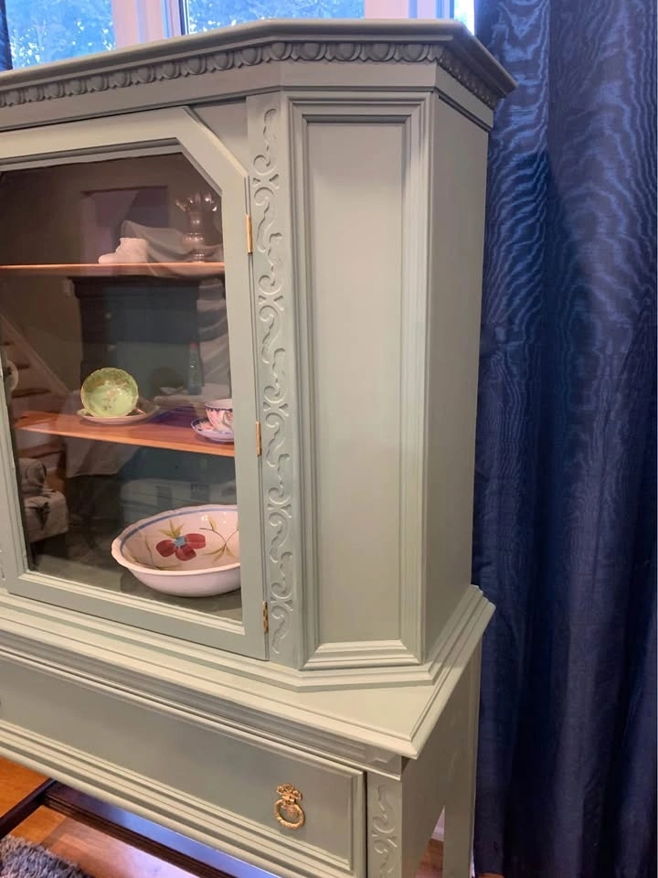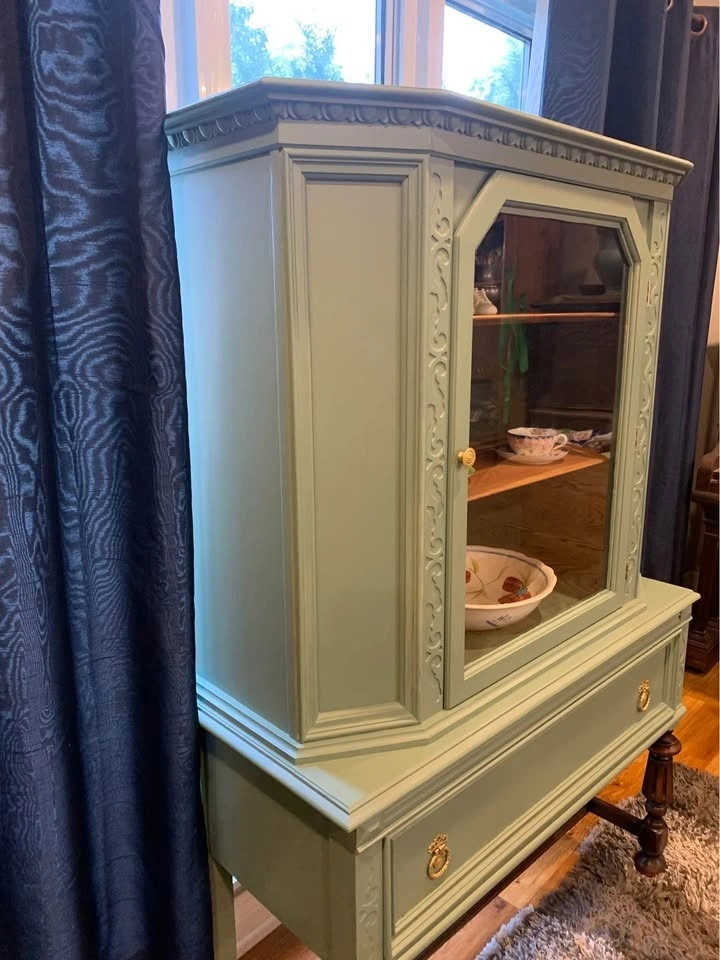 Whether country or city living, this refinished hutch will be a lovely addition to your space. It has been cleaned, primed, and painted in a soft green color. The legs and base have been stained in a dark walnut, and the entire piece has been top-coated for long-lasting protection and durability. Dimensions: Height- 62”, Width- 41 & 1/4”, Depth- 17”. Pick up in Brampton L6T2S6.