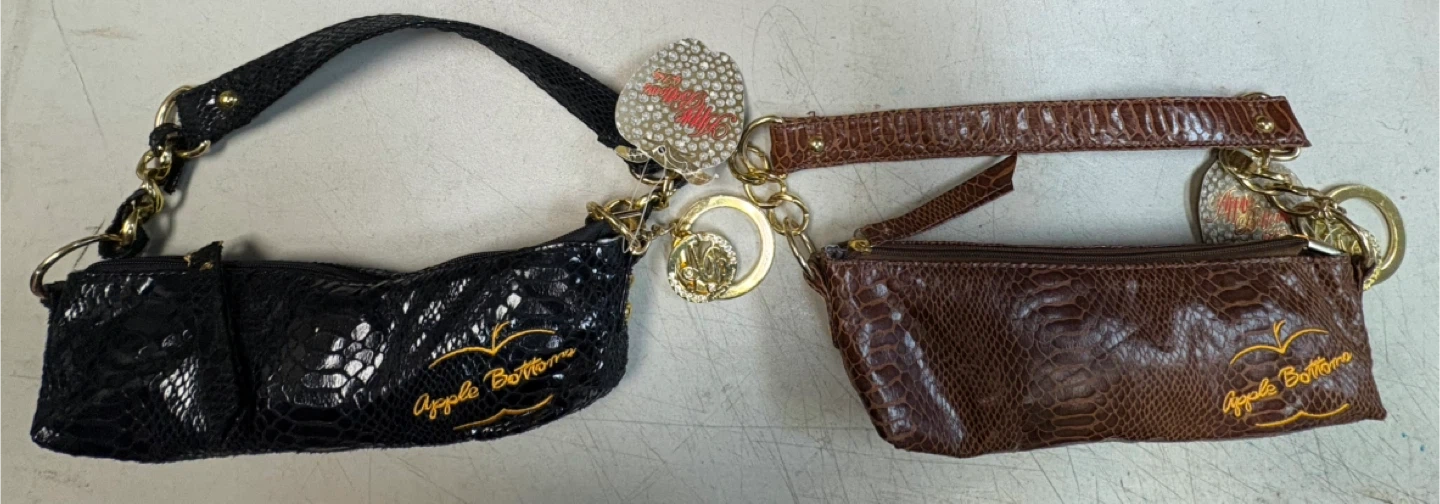 This is a set of two small Apple Bottoms purses, one in black and one in brown. Both feature a snakeskin-like texture and gold-tone hardware. They're perfect for carrying small essentials.