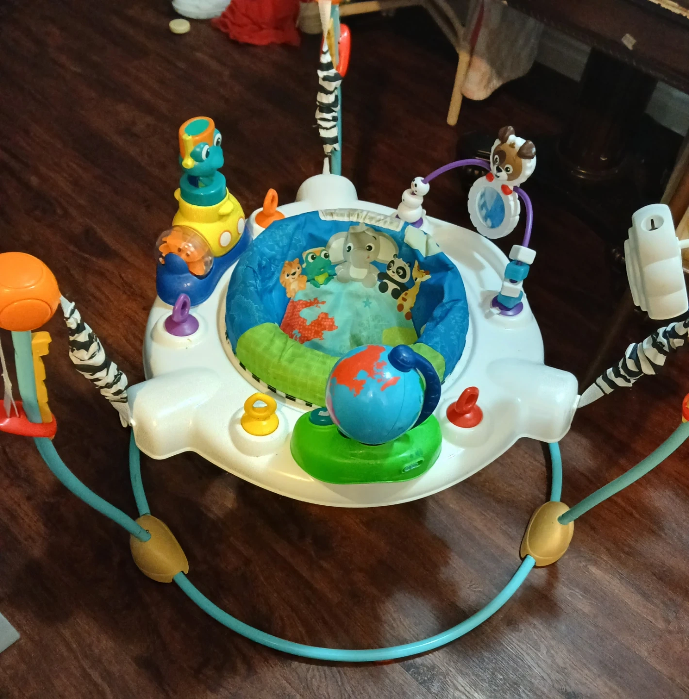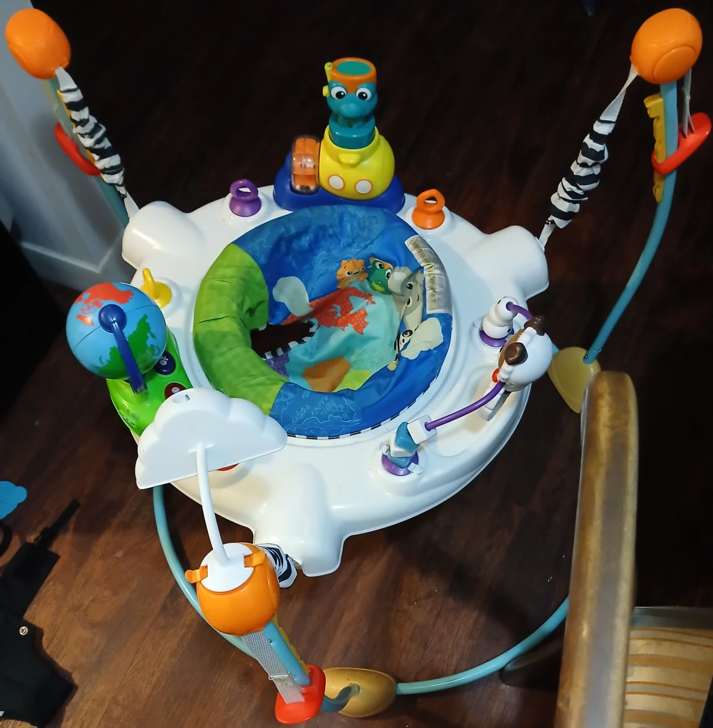 This Baby Einstein Jumper features multiple toys for baby's exploration. It has a spinning seat and music options. Provides bouncing fun for little ones!