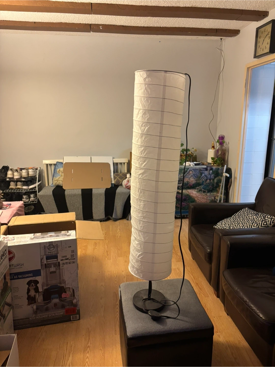 Tall white paper floor lamp. It has a flexible accordion-style paper shade. This lamp would fit well in a living room or bedroom. Power cord included. There is just a little rift as shown on the picture.