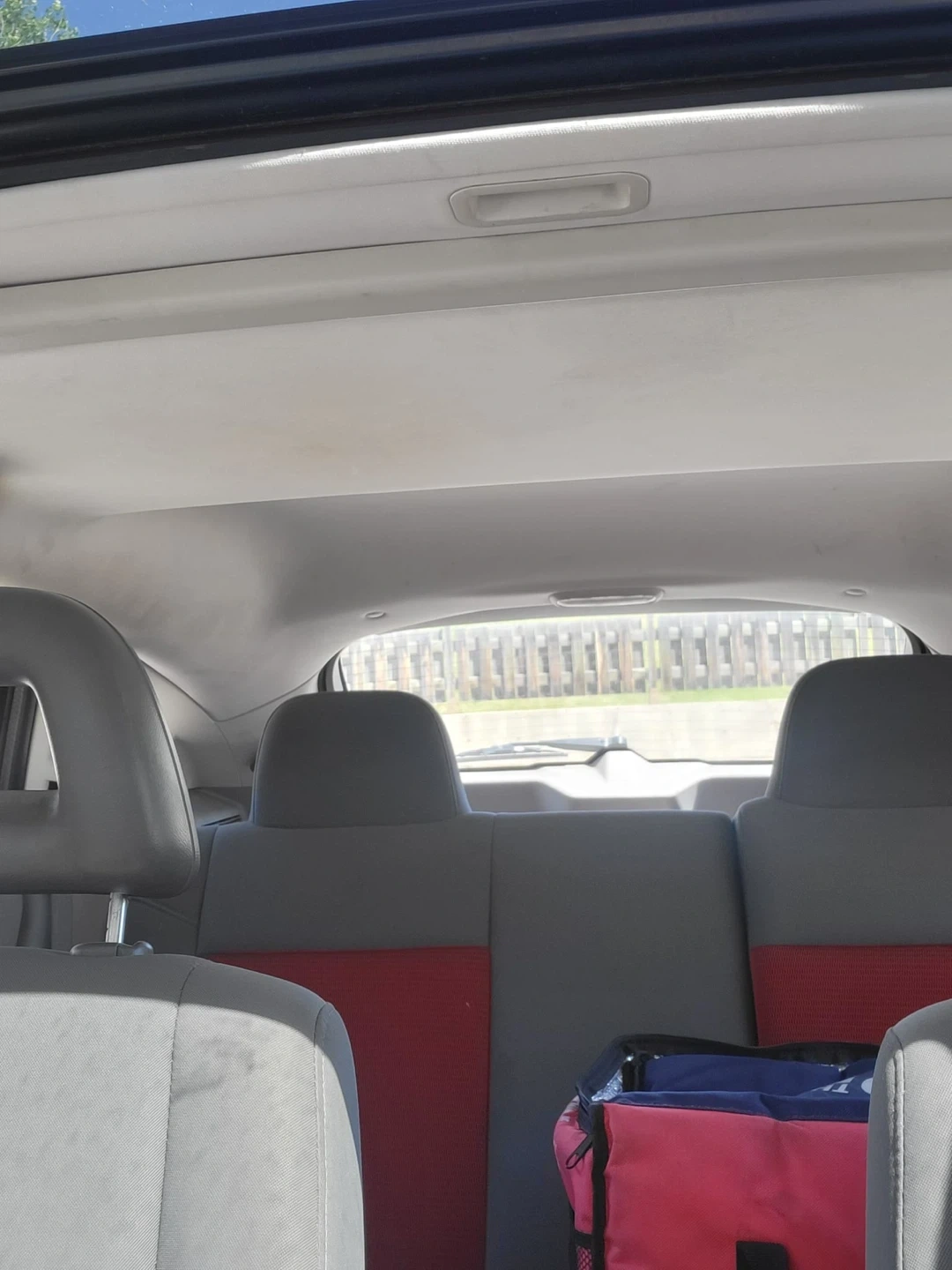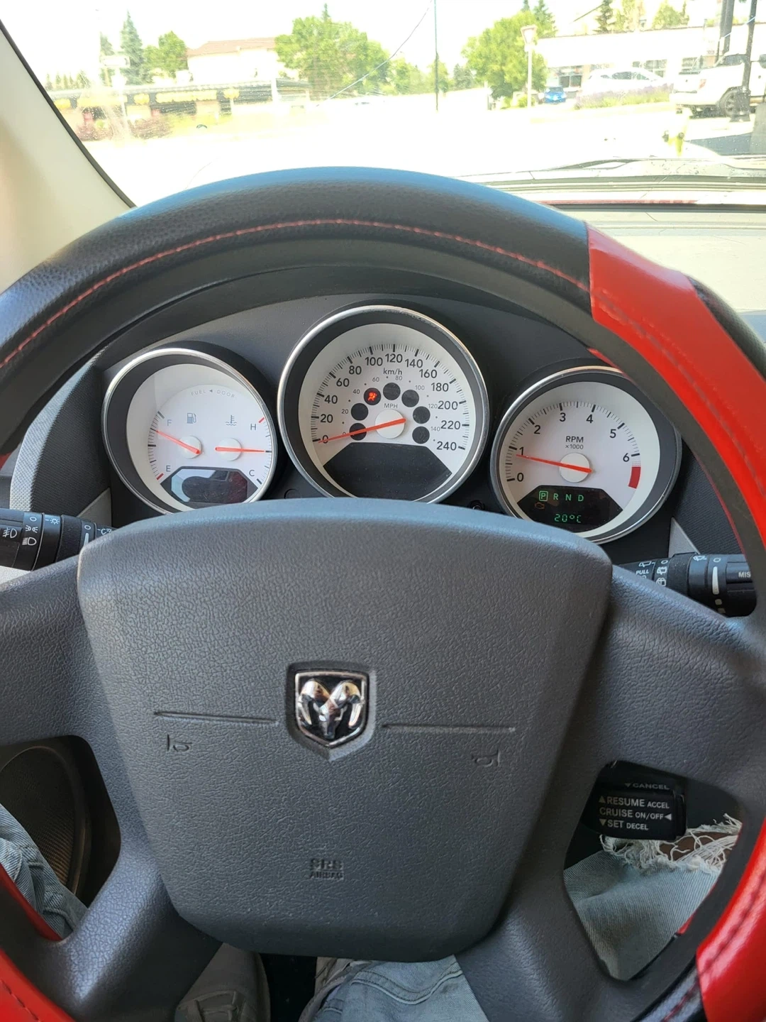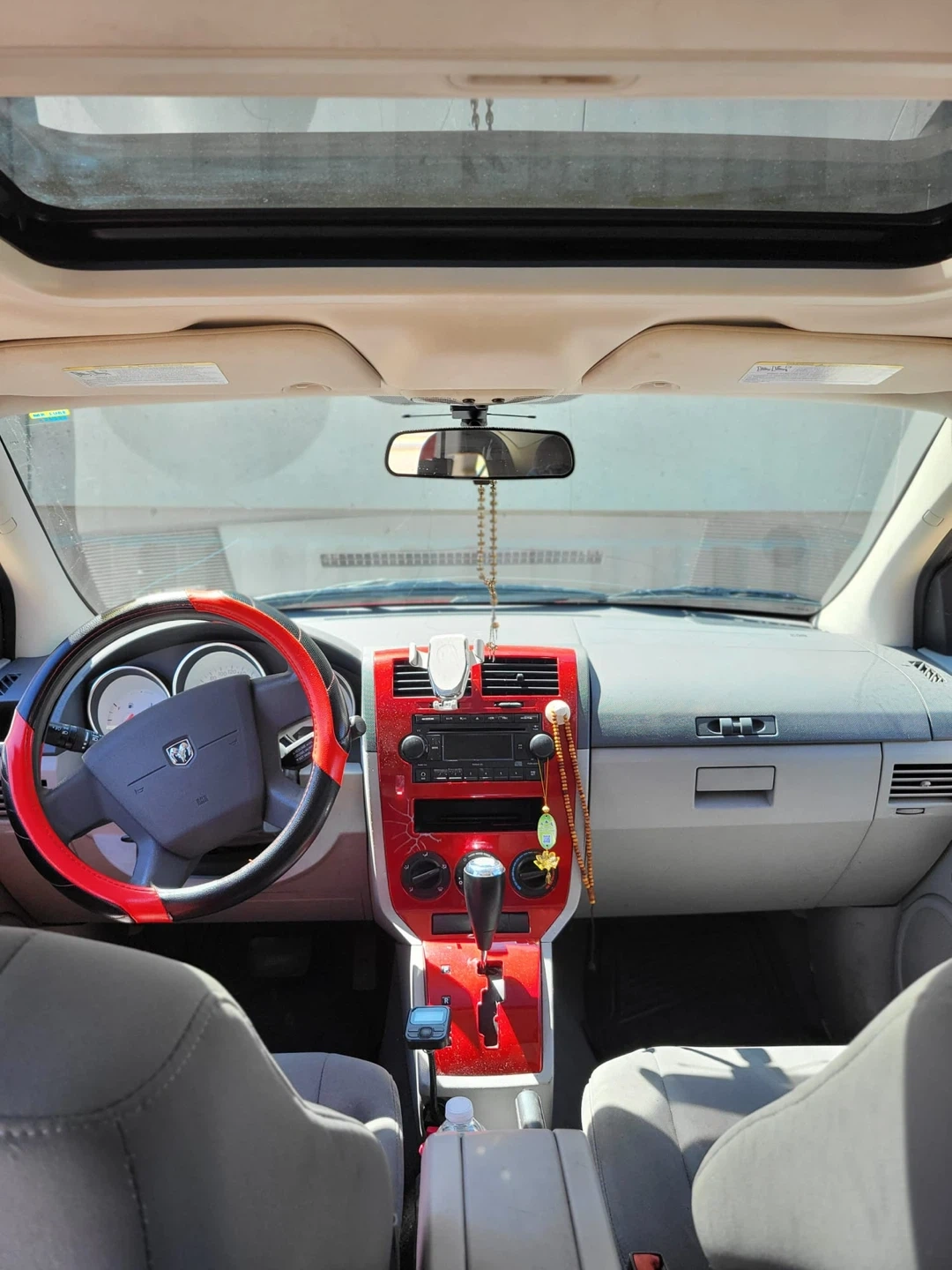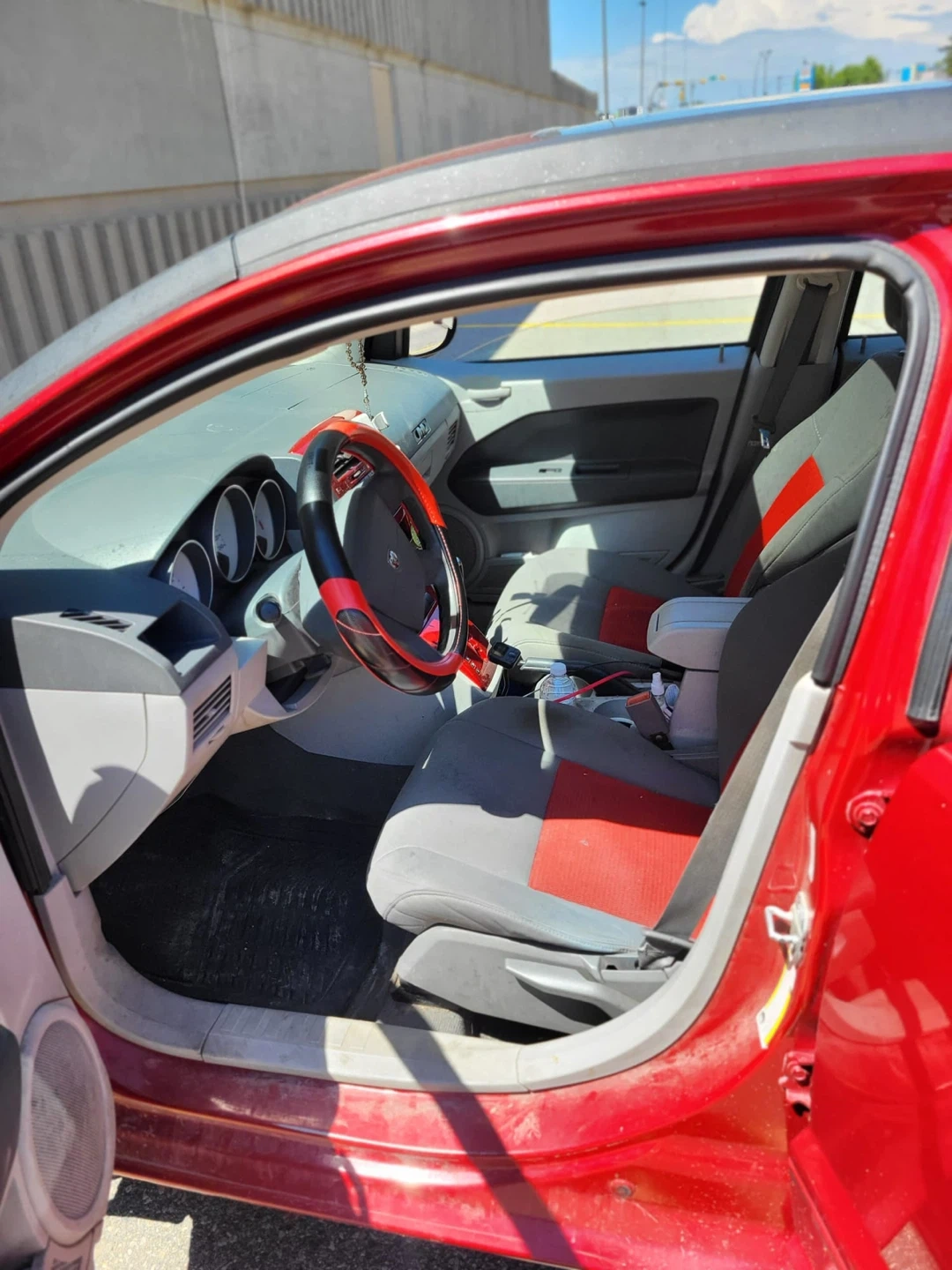 This is a red Dodge Caliber hatchback. It has a two-tone grey and red interior. The steering wheel has red accents.