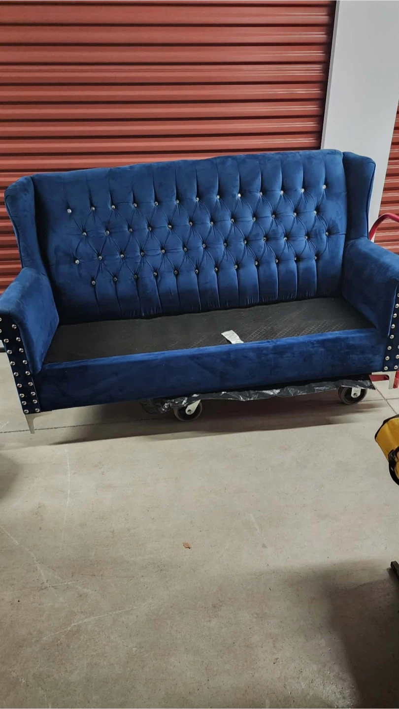 Classic deep button tufted sofa upholstered in a rich royal blue velvet fabric. It's detailed with silver nailhead trim and sits on decorative silver legs. This sofa adds a touch of elegance to any living space. It's approximately 7.5 feet long.