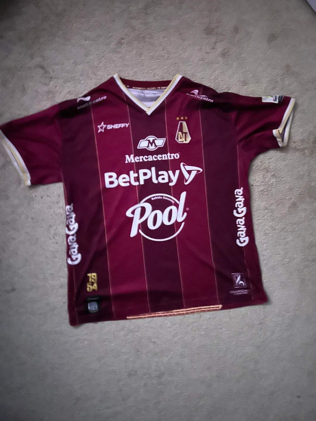 Maroon soccer jersey with white and gold accents. Features multiple sponsor logos on the front, including BetPlay and Pool. The back displays the number 70 and 'TAPA ROJA'.
