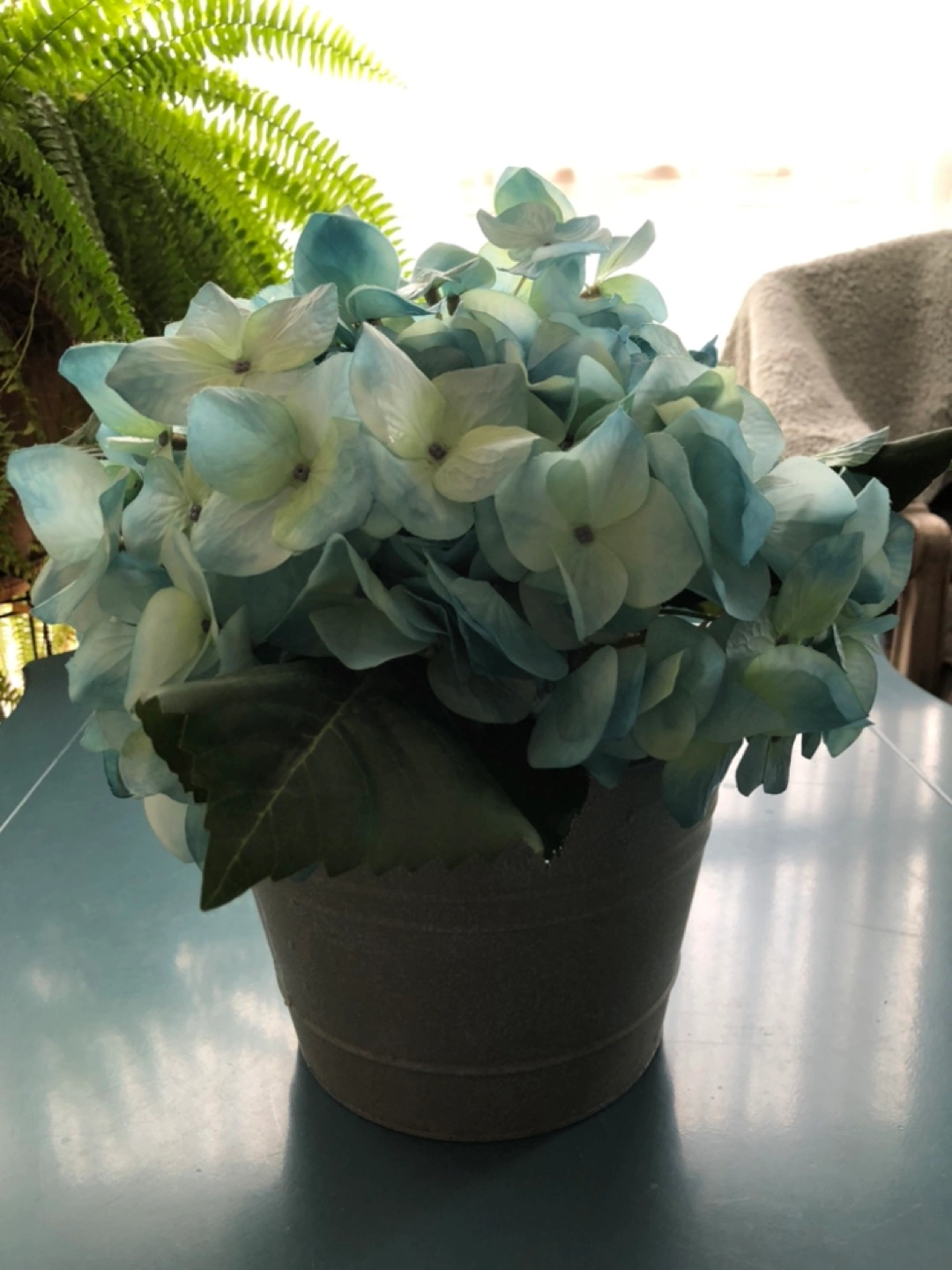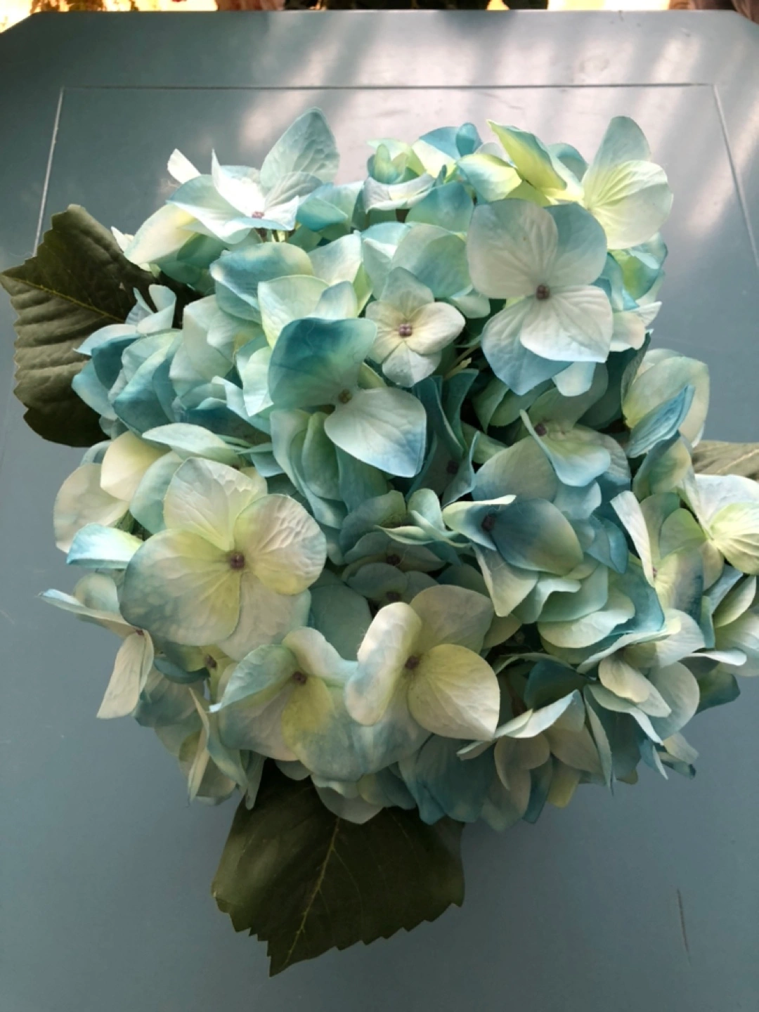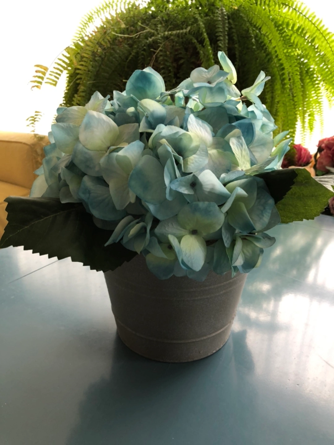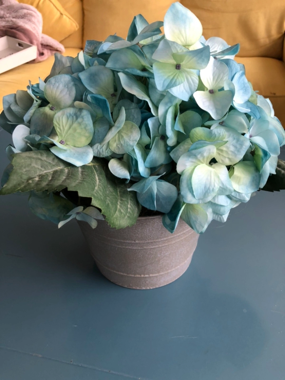 Hydrangeas in shades of blue and green. Comes in a grey, rustic-style pot. Ideal for decorating spaces to create a tranquil atmosphere.