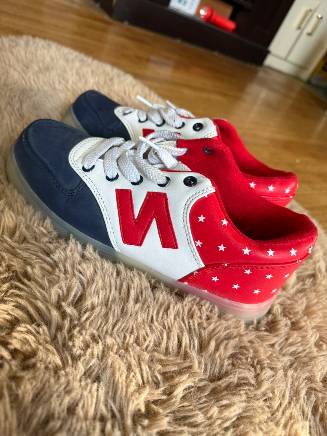 These cool sneakers feature a red, white, and blue design with white stars on the heel. They have classic white laces and a durable sole.