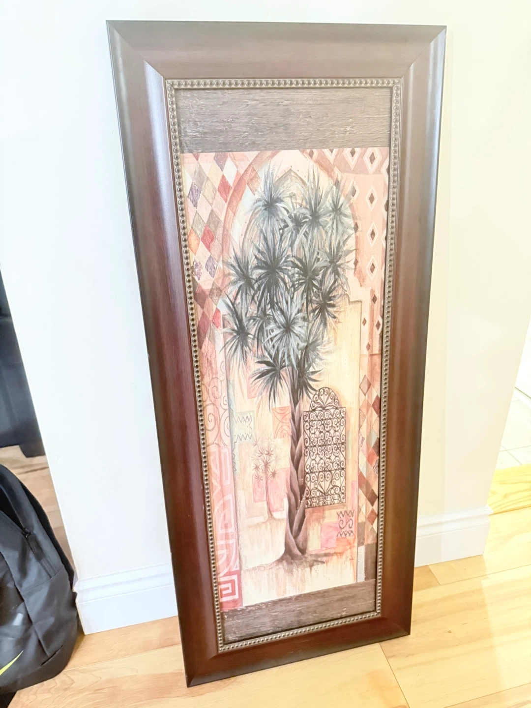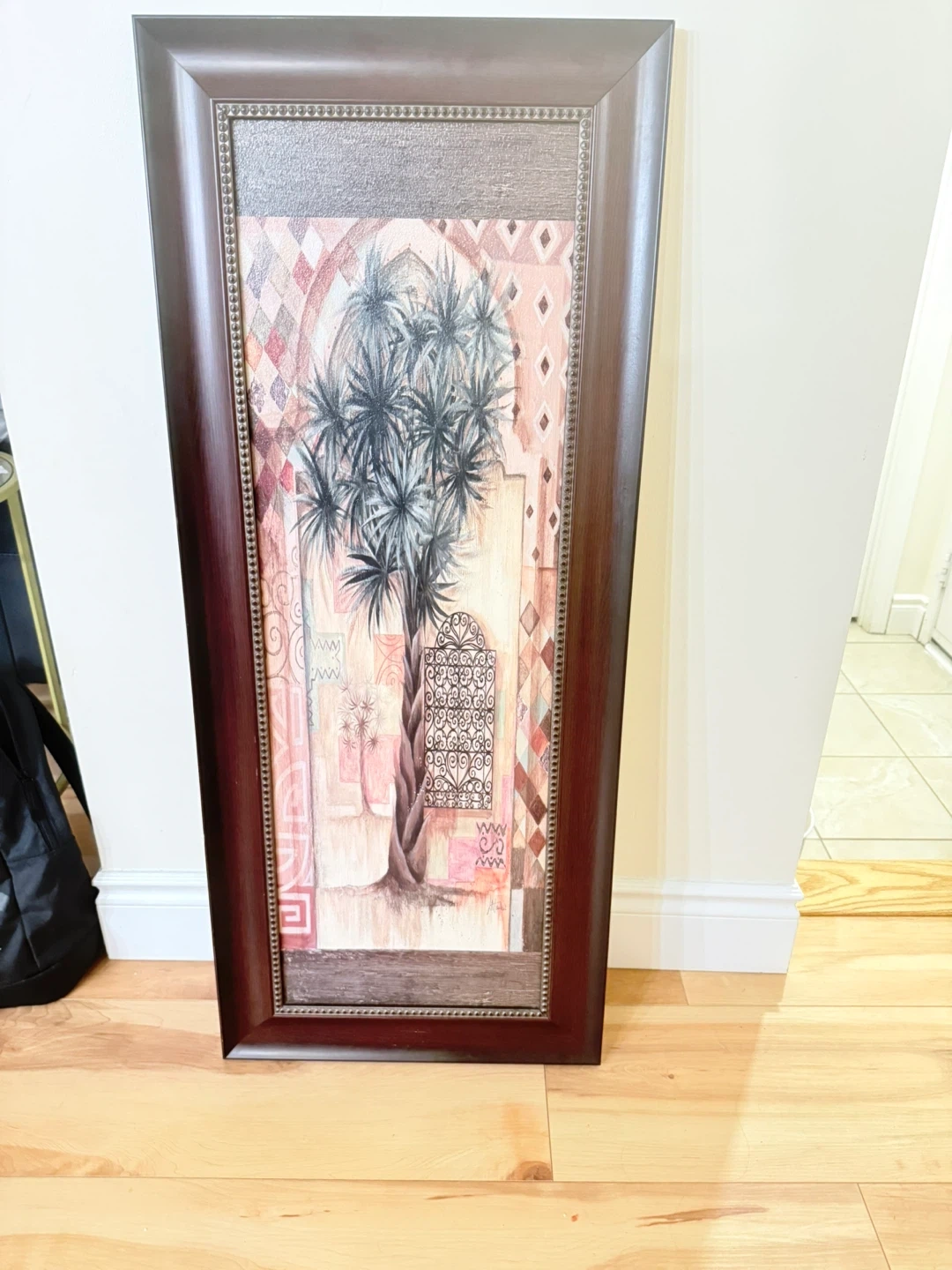 This framed wall art features a print of a tropical tree with intricate geometric patterns in the background. It's set in a dark brown, rectangular frame with a distressed wood-look insert. The art piece brings a touch of nature and exotic design to any room. It's ready to hang and adds a decorative element to your living space.
