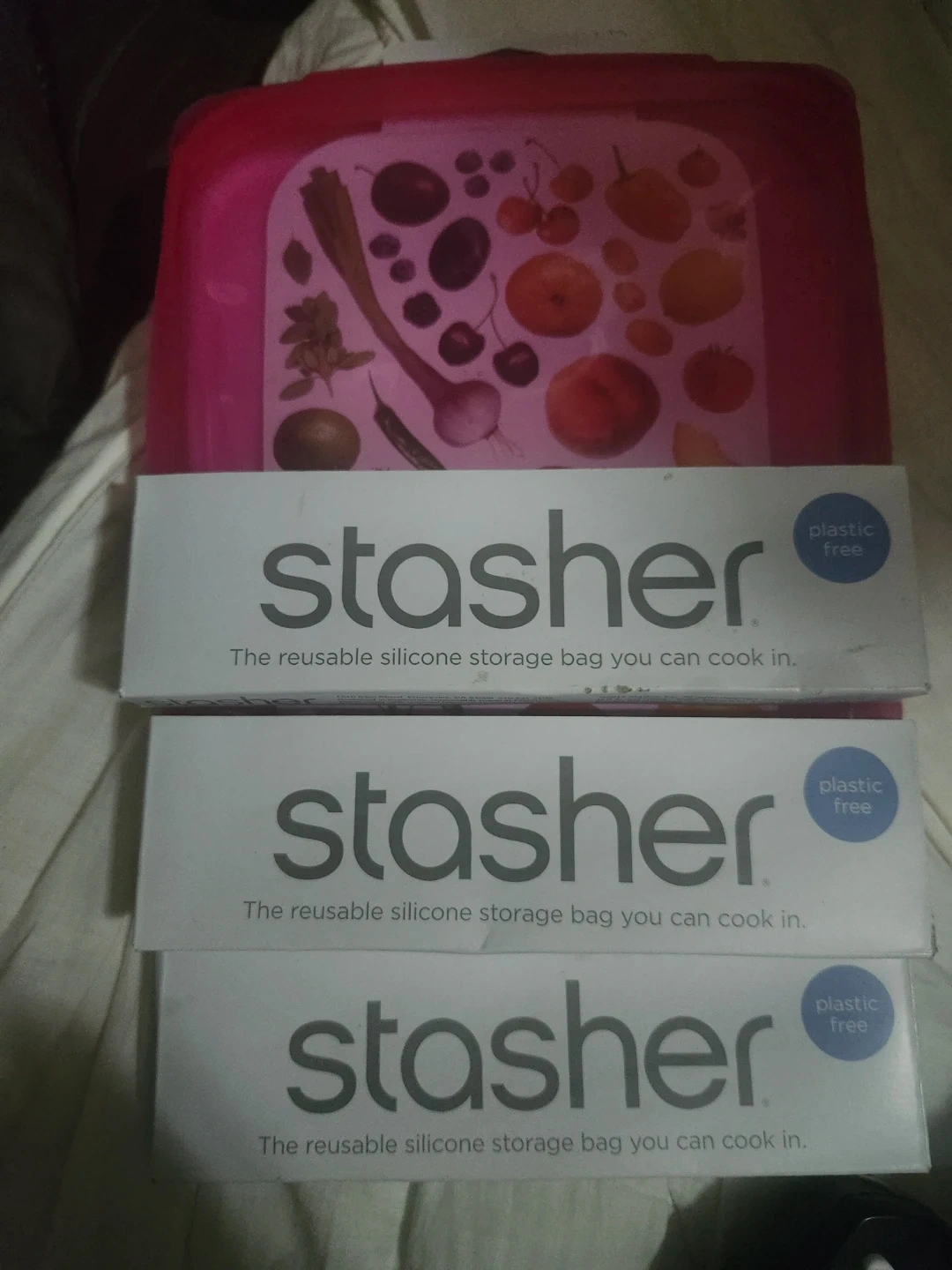 This listing includes three Stasher reusable silicone storage bags. They're designed for storing food and can be used for cooking. These bags are plastic-free and durable!