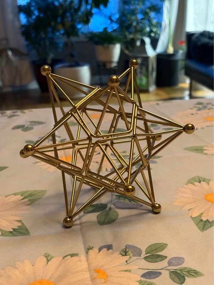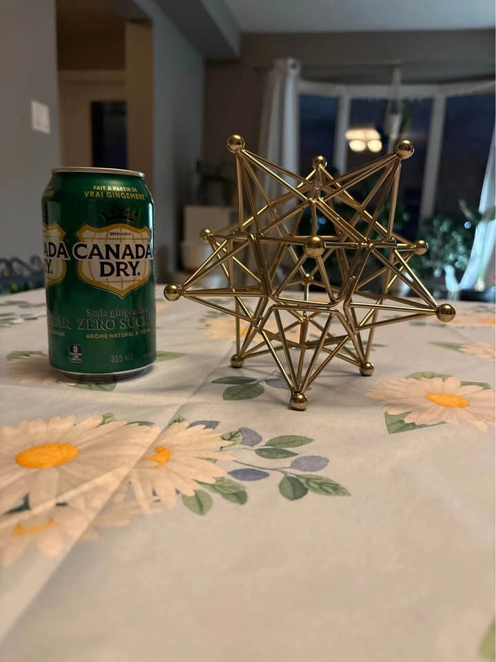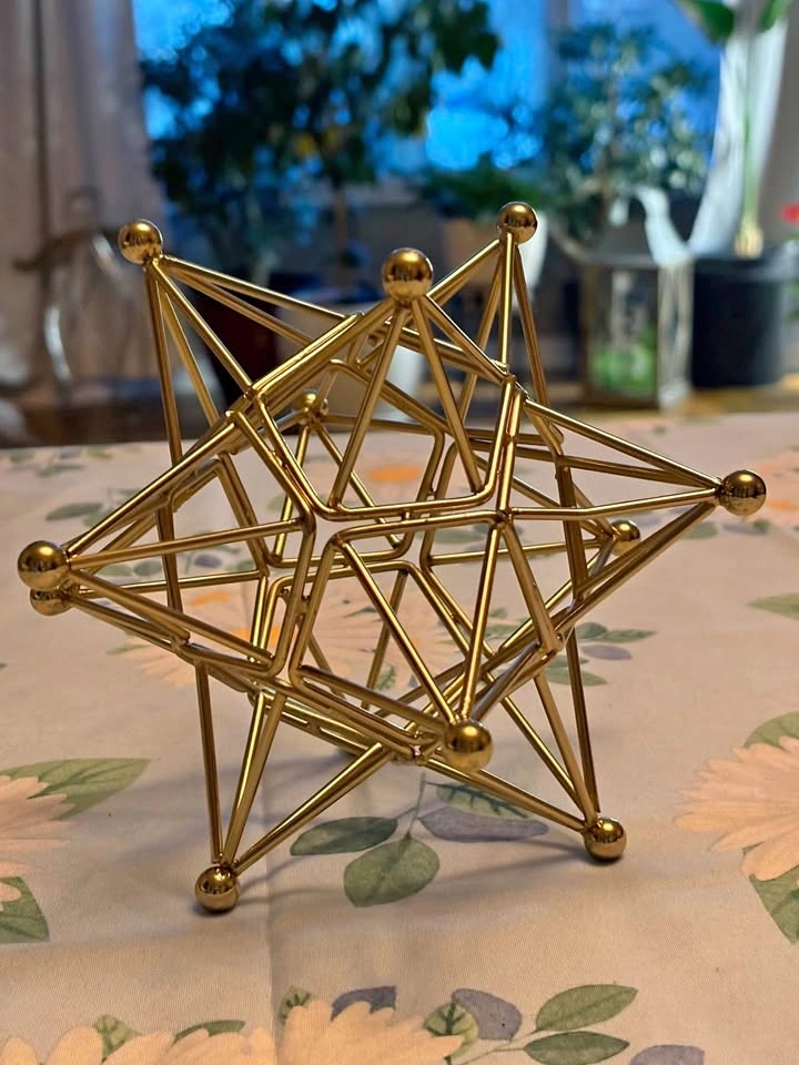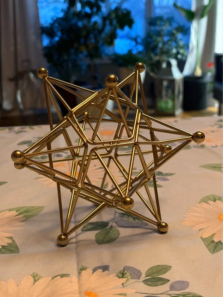 Beautiful gold-tone metal geometric star sculpture. This is a sturdy, wireframe piece perfect for a desk, bookshelf, or coffee table. Style: Modern / Mid-Century / Industrial. Condition: Excellent, like new. Size: Approx. 5-6 inches tall (see photo with soda can for scale). Originally from HomeSense. Adds a great architectural touch to any room. Pickup in Fergus.