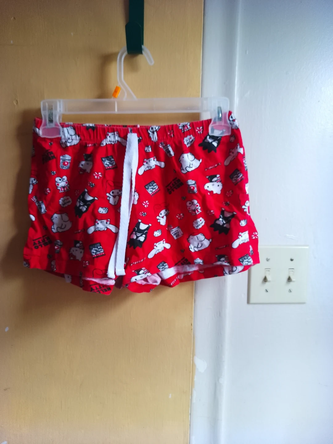 These red pajama shorts feature a fun Hello Kitty and Friends all-over print. They have an elastic waistband and a drawstring. Size is small.