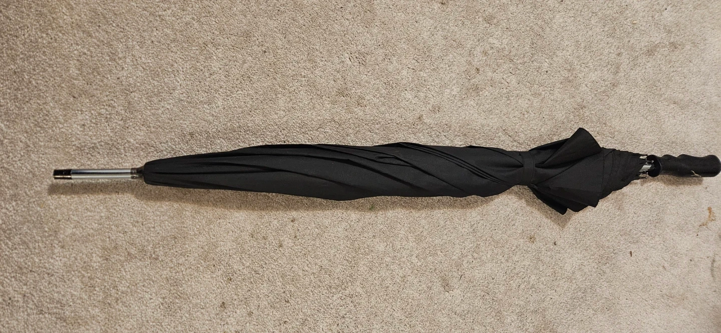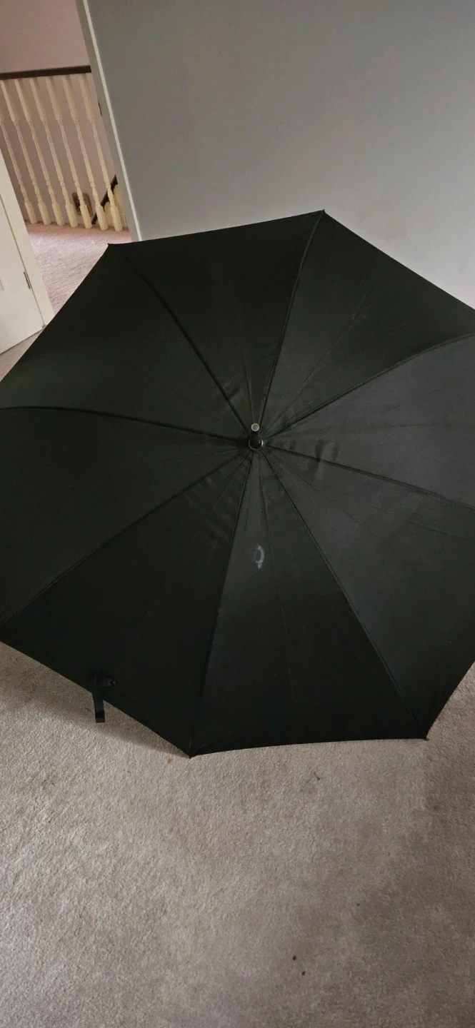 A classic extra large black umbrella for rainy days. It's made with durable fabric and features a comfortable handle for a good grip. This umbrella's simple design makes it a practical accessory for anyone. Ready to keep you dry!
