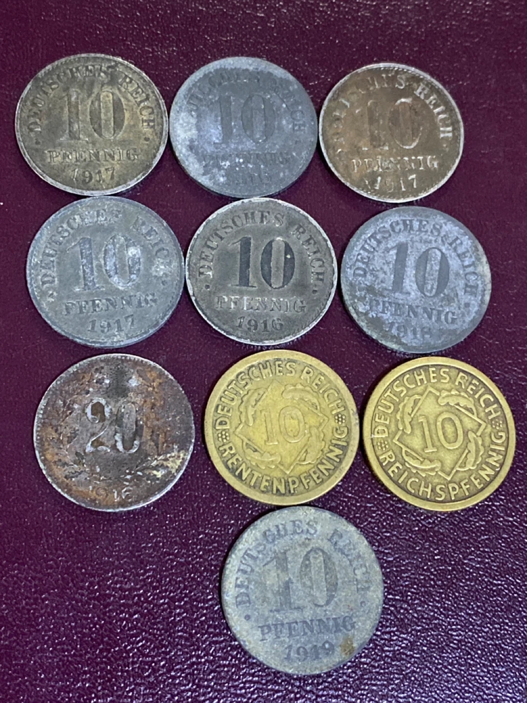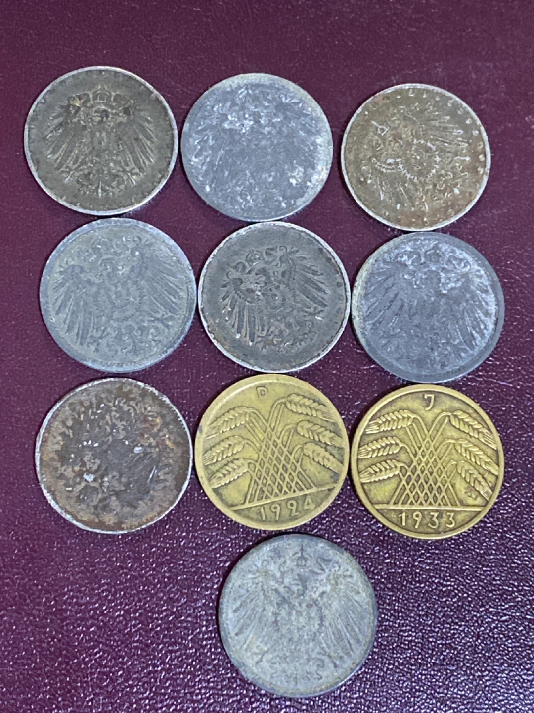 This lot includes several German Pfennig coins from various years, featuring eagles and agricultural motifs. Years visible include 1916, 1917, 1919, 1924, and 1933. These coins are ideal for collectors interested in German numismatics.