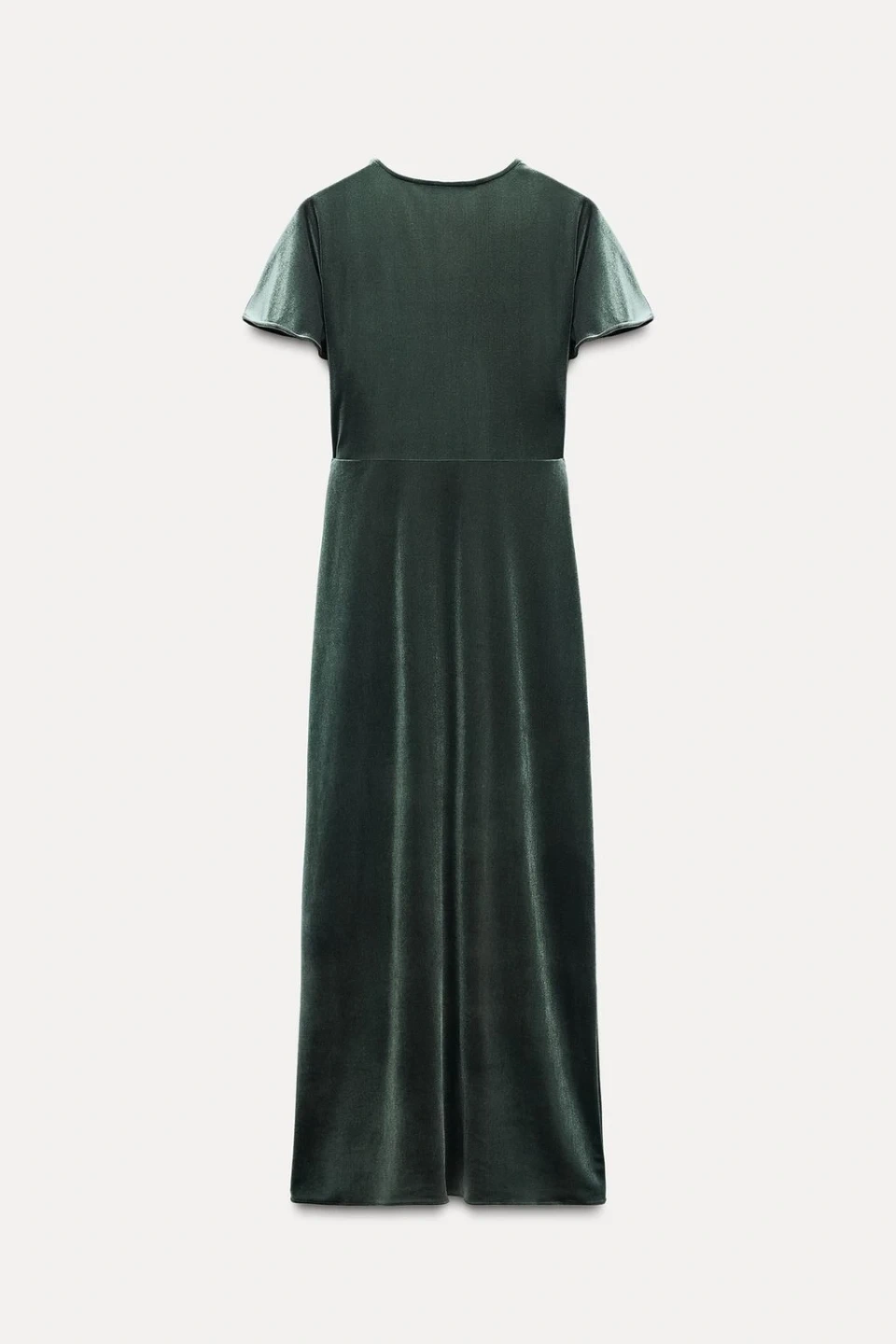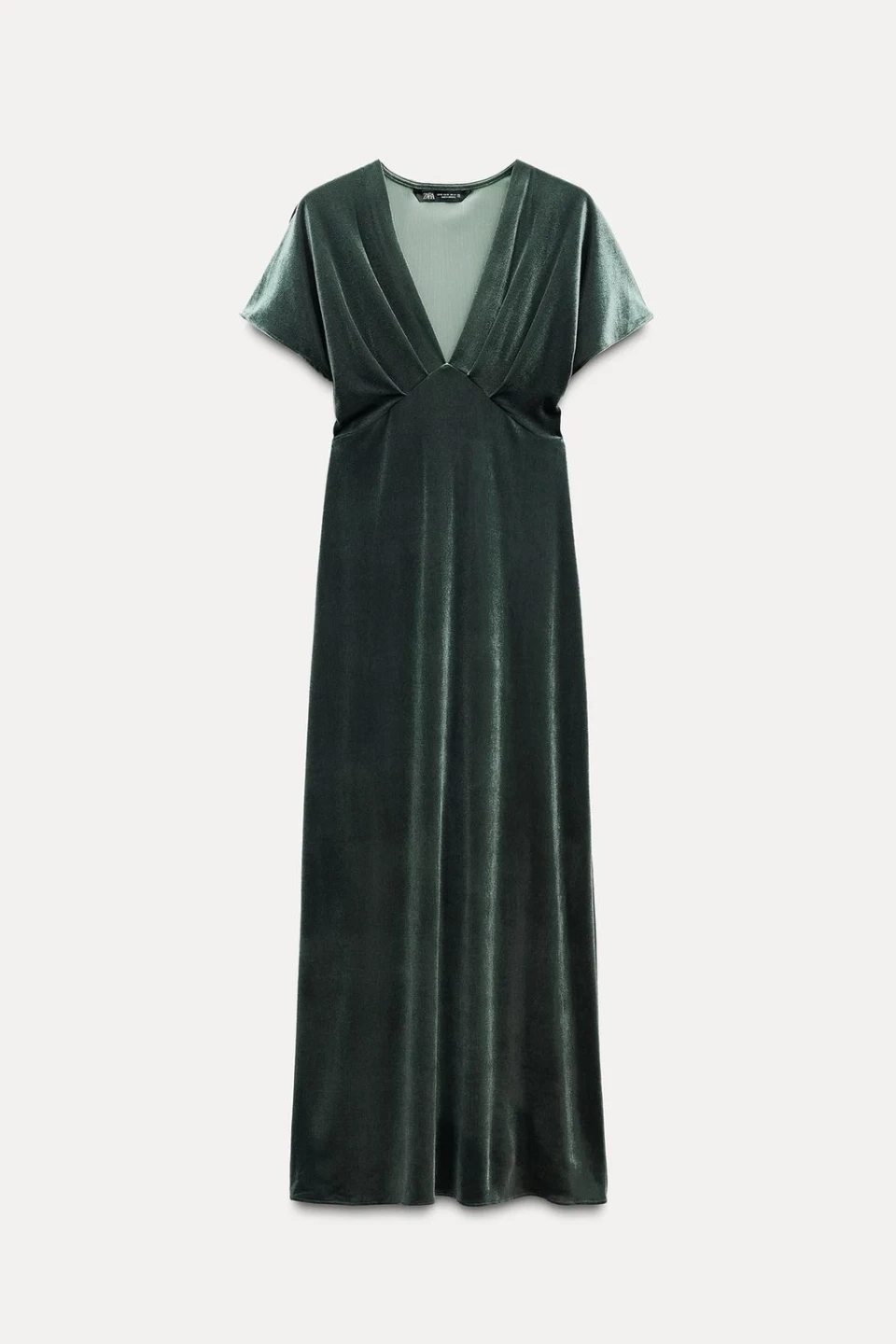 A ZARA velvet midi dress in a dark green hue. It's made with a soft velvet material and features a flattering V-neckline with draped detailing. This dress is great for evening wear or special occasions!