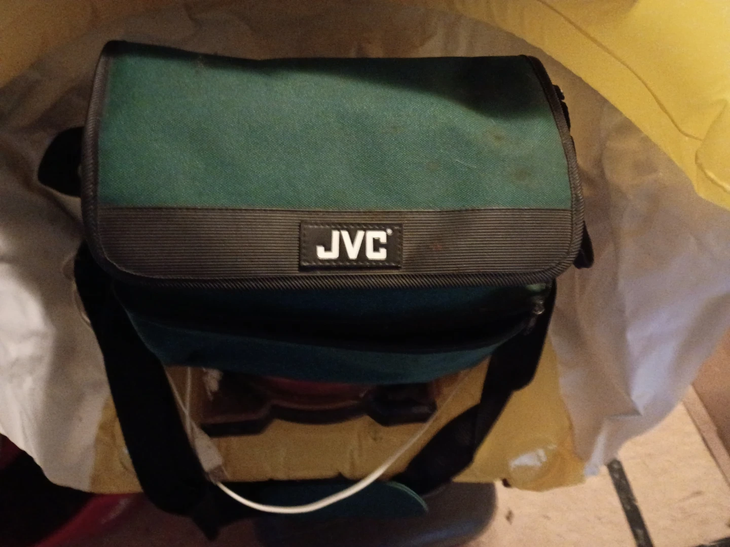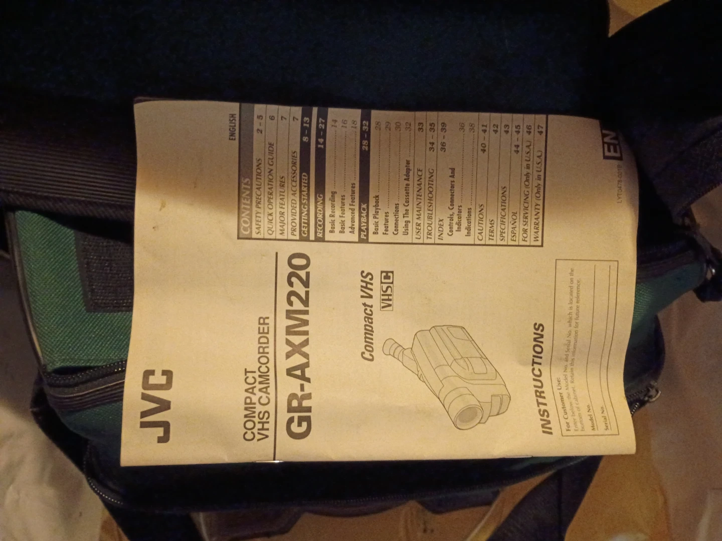 This JVC camcorder records in Compact VHS format and features 300x digital zoom. It includes a carrying bag for easy transport. A manual is also provided.