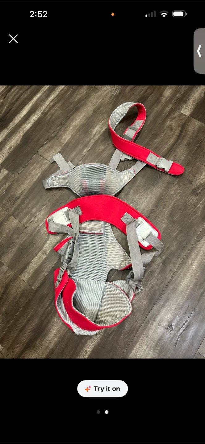 This is a red baby carrier with adjustable straps. It's designed for comfort and convenience. The carrier is made from durable fabric.