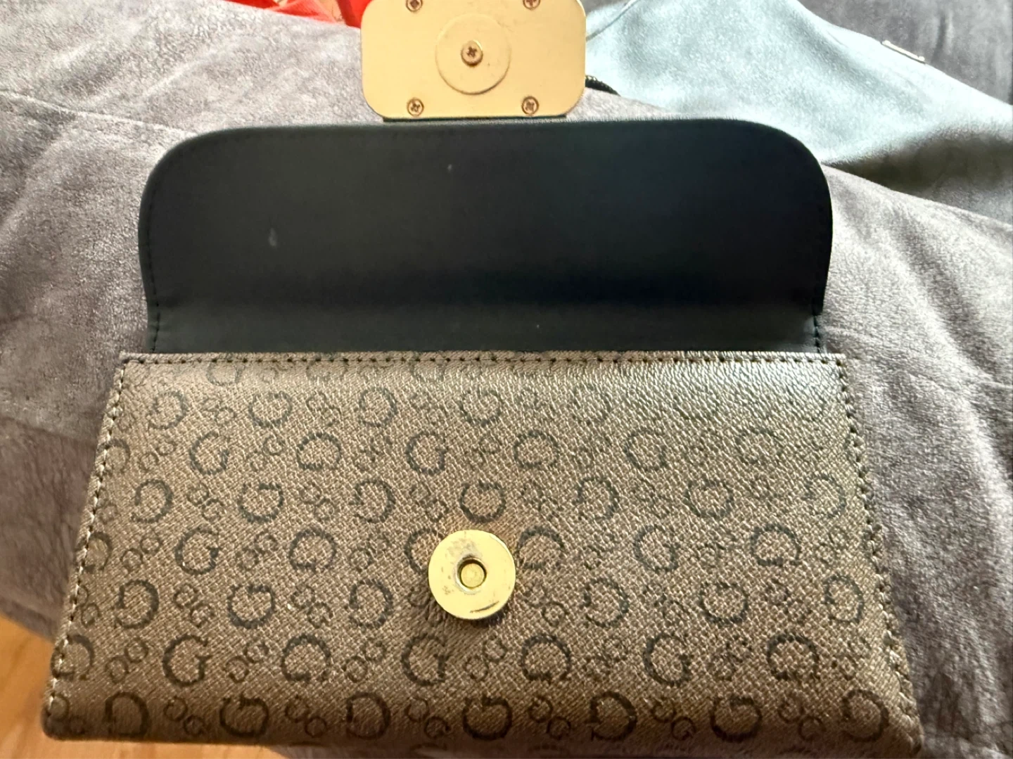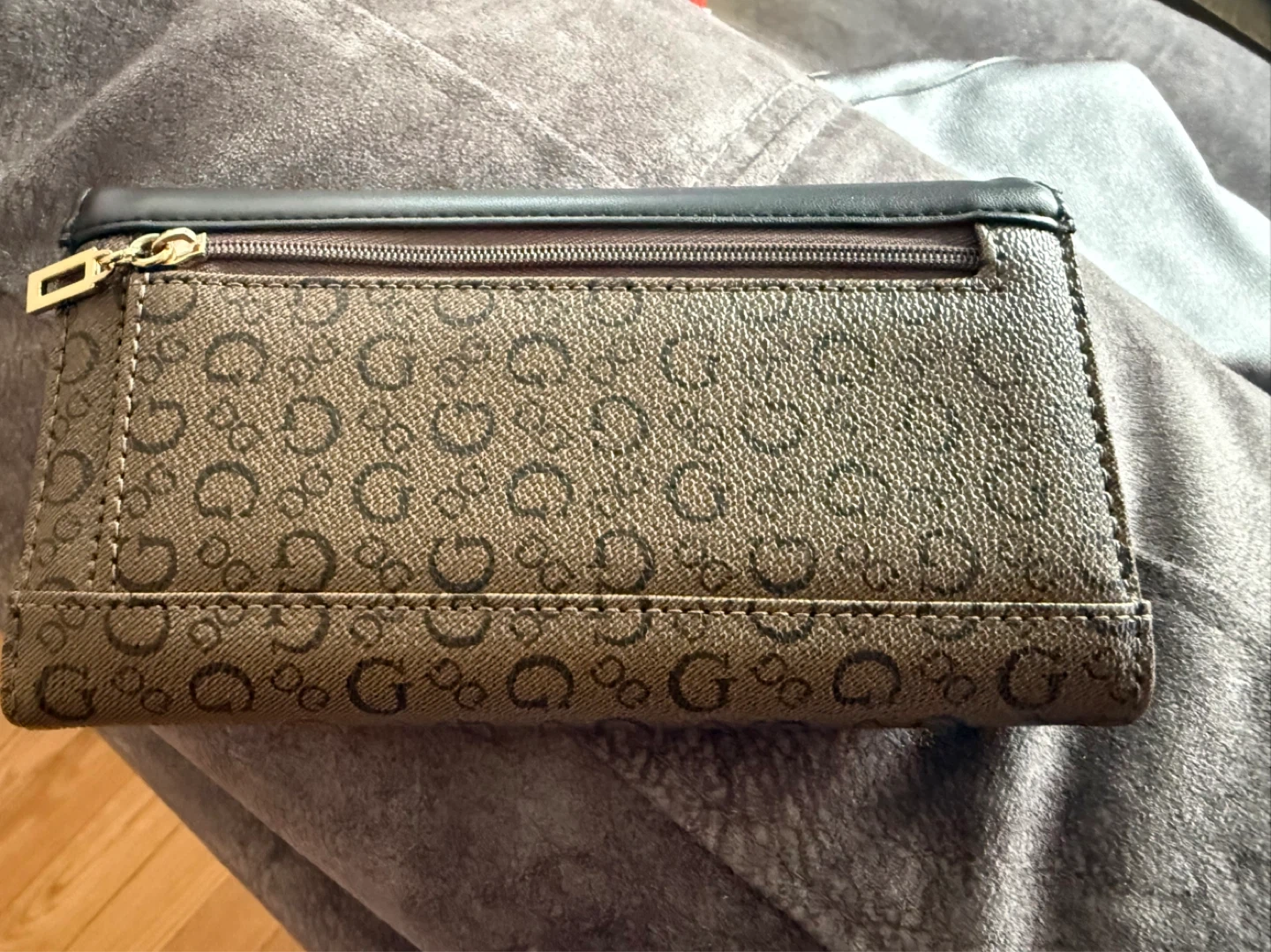 This is a Guess wallet with a brown monogram pattern. It features multiple card slots and a clear ID window. A zippered compartment is also included for extra storage.