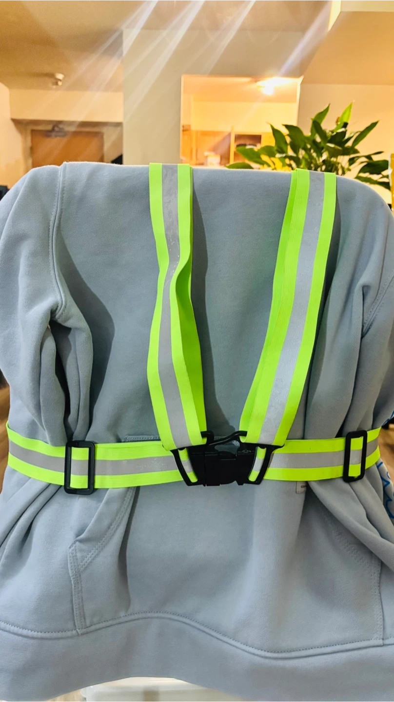 This safety straps have a bright neon yellow and silver reflective straps across the front and back. The adjustable buckle closure secures the chest strap. Great for visibility!