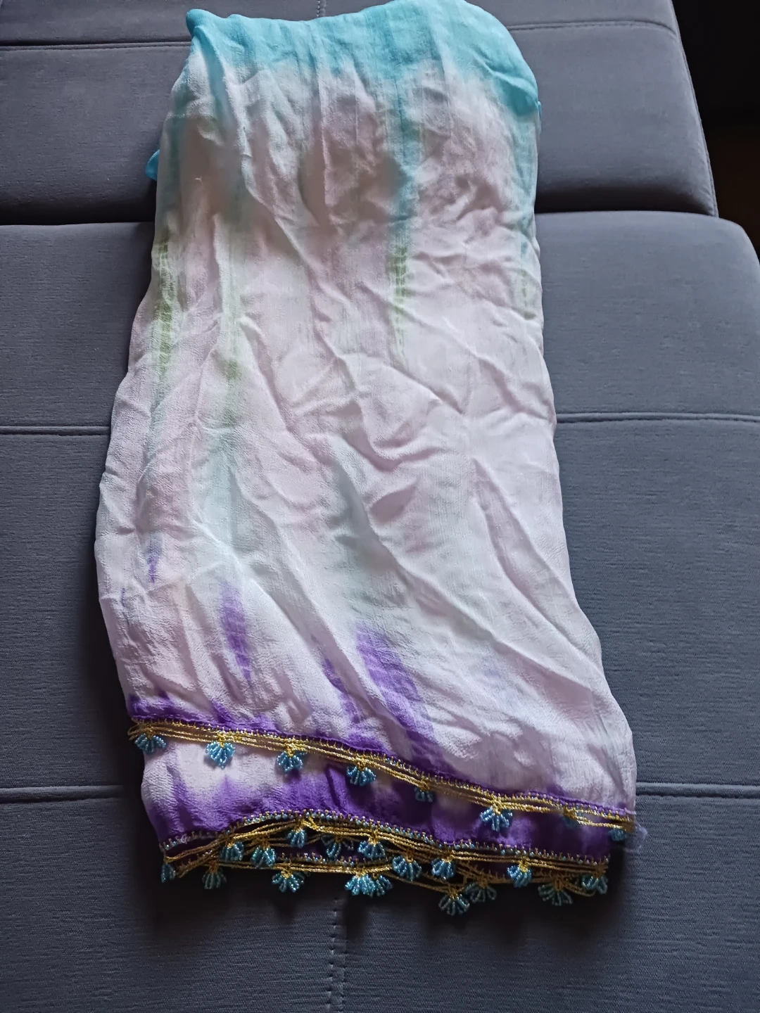 A beautiful, lightweight scarf with a watercolour tie-dye effect in shades of purple, blue, and green. It features a delicate gold and blue beaded trim along the edge. This accessory adds a pop of colour to any outfit!