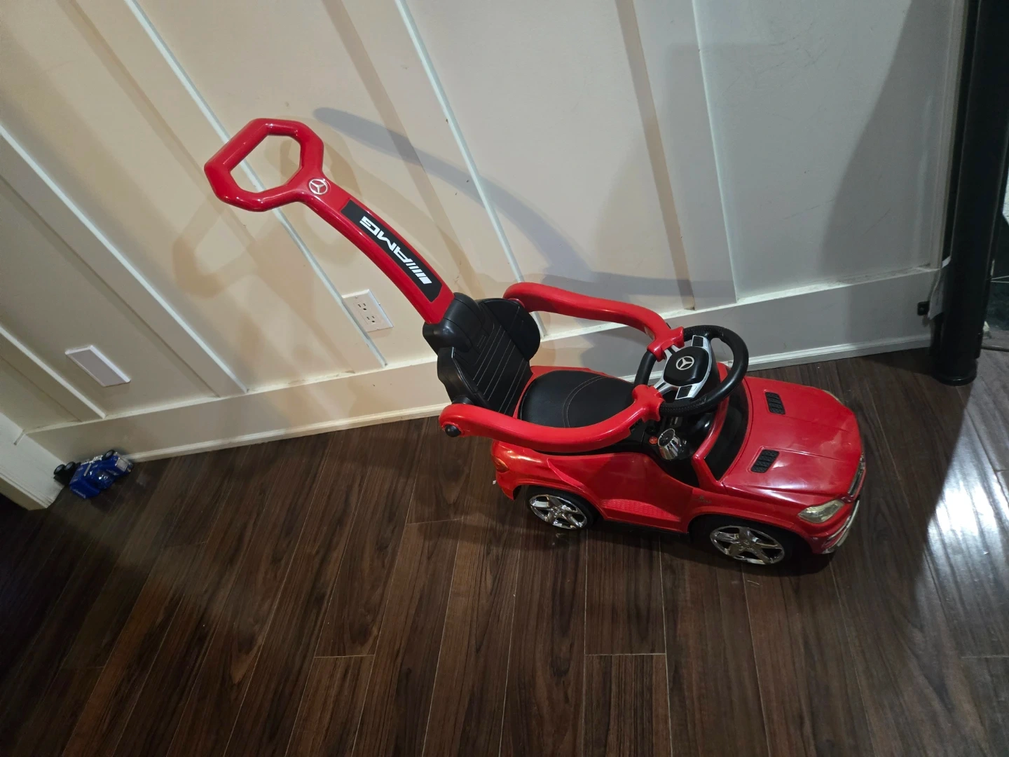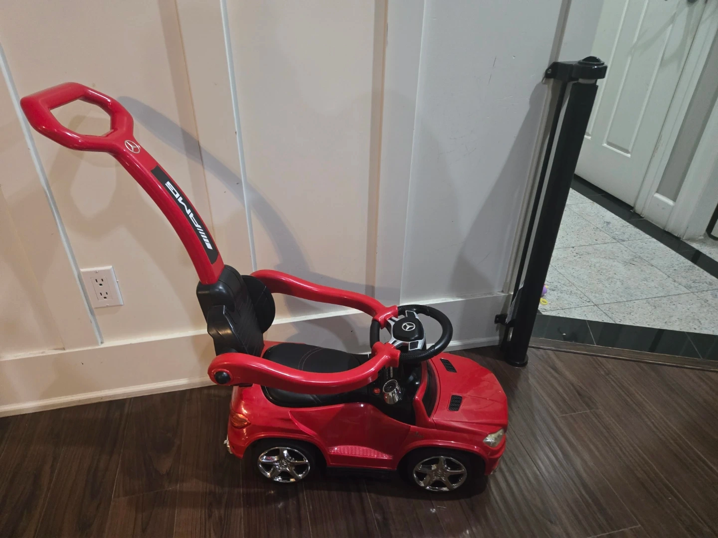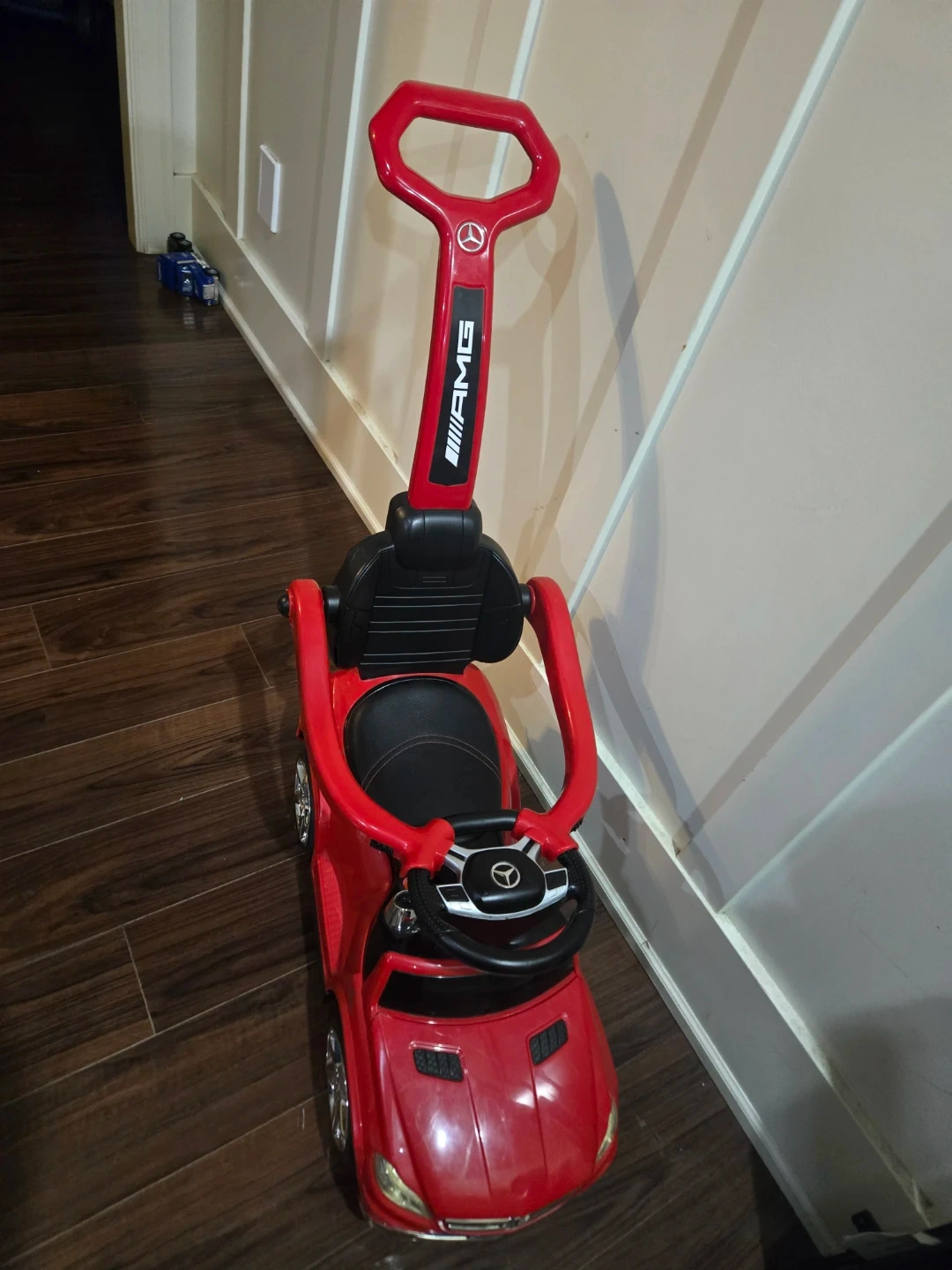 This is a red Mercedes-Benz AMG ride-on push car for kids. It features a removable handle for parent steering and a built-in steering wheel for little ones.