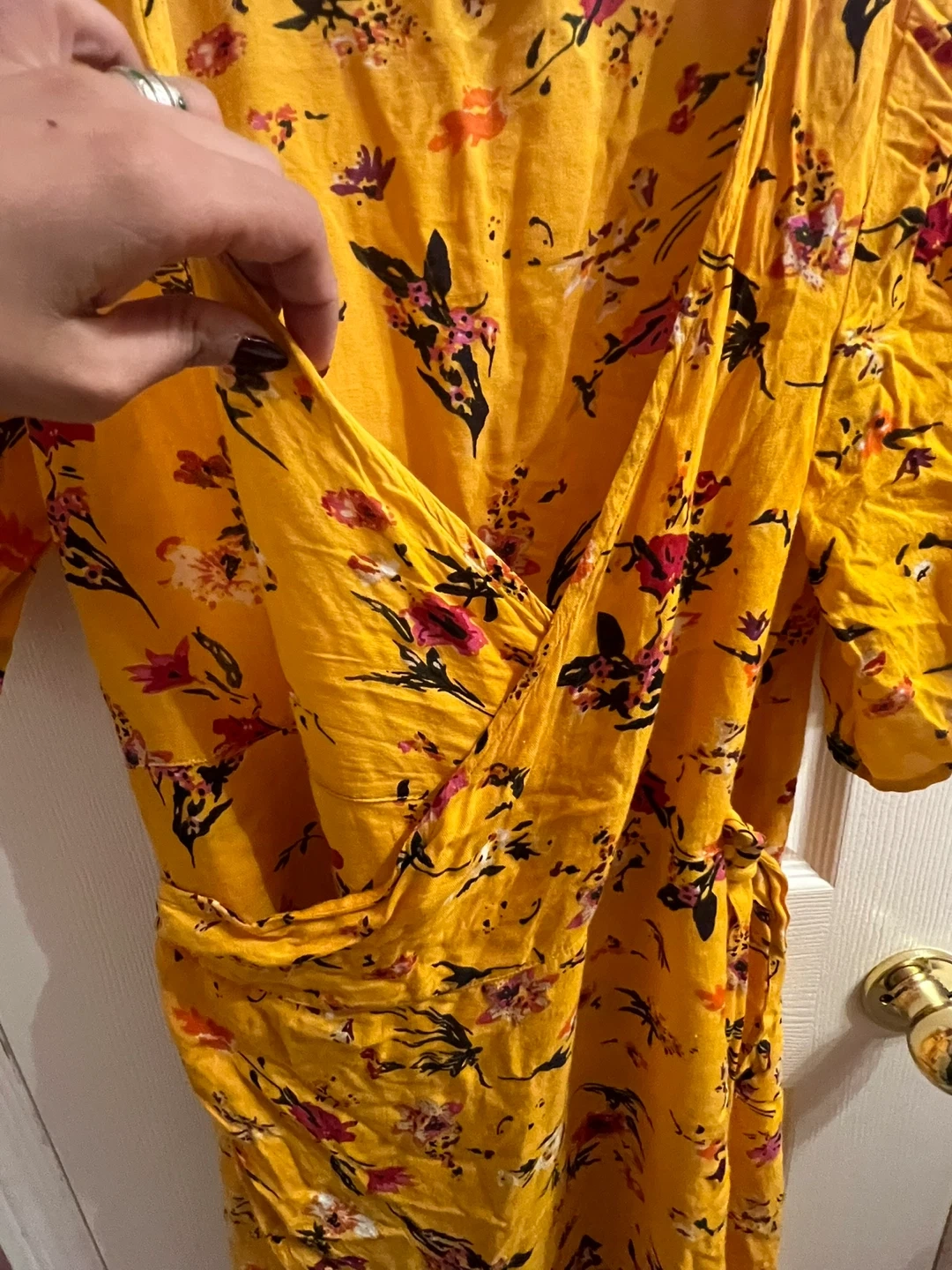 This is a yellow wrap dress with a floral print. It features short sleeves and a tie waist for an adjustable fit. The fabric is lightweight and drapes nicely.
