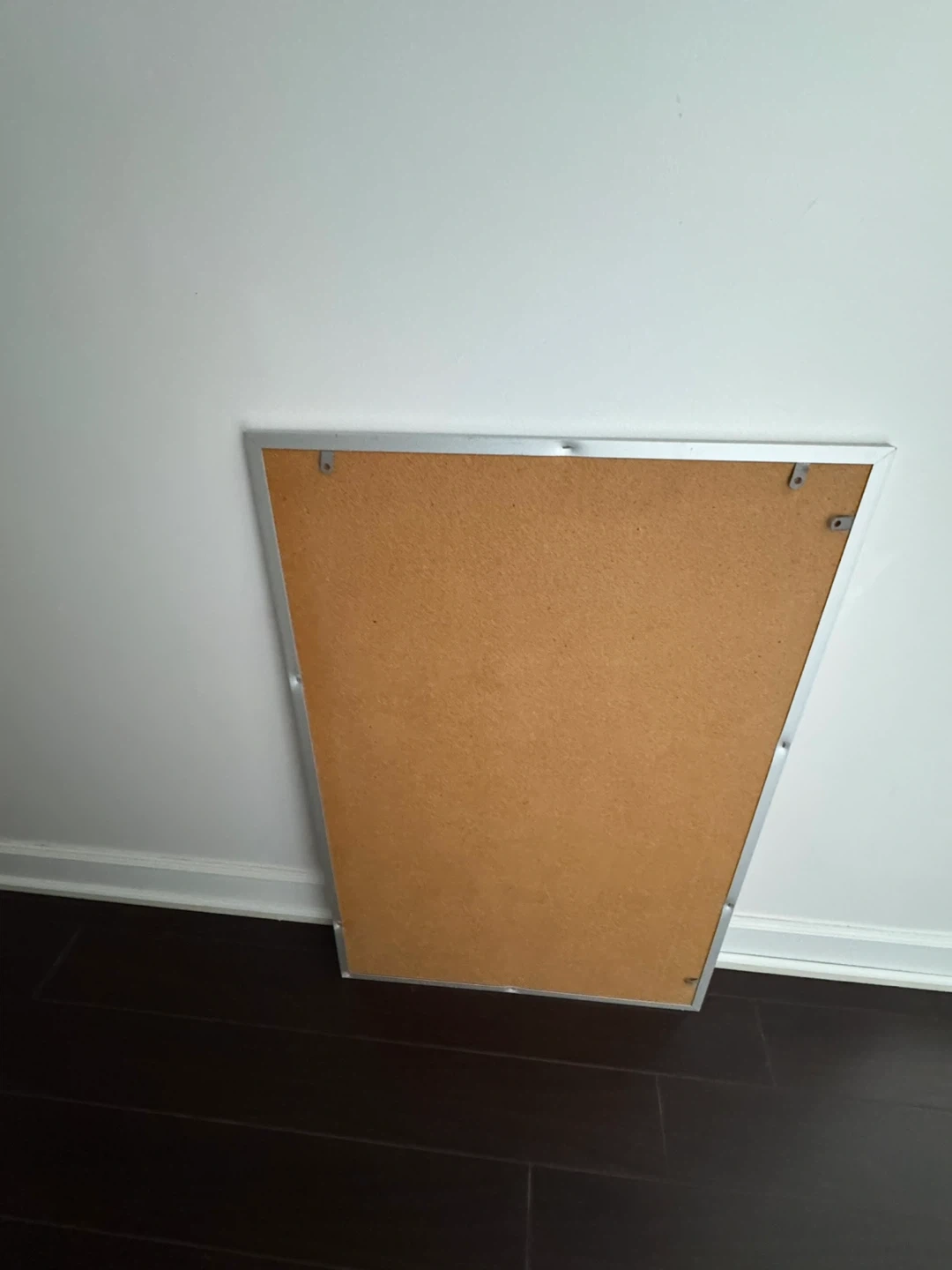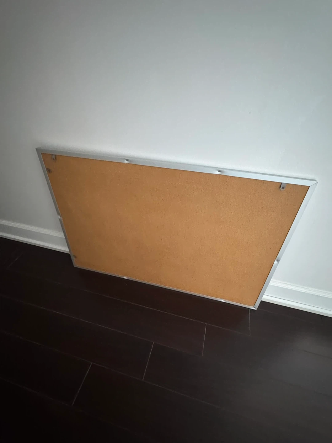 This is a cork bulletin board with a silver metal frame. It's perfect for pinning notes, photos, or reminders. The board measures approximately 24 inches by 36 inches.