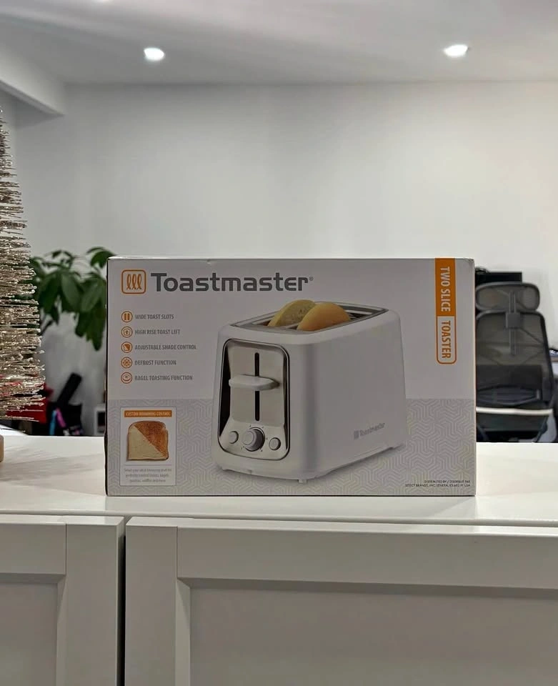 Toastmaster 2-slice toaster, used a few times only and includes everything inside the box. Features adjustable browning control, defrost and bagel functions, and wide slots for different types of bread. Simple and easy to use with a clean white design. Perfect for home, dorm, or small kitchen.