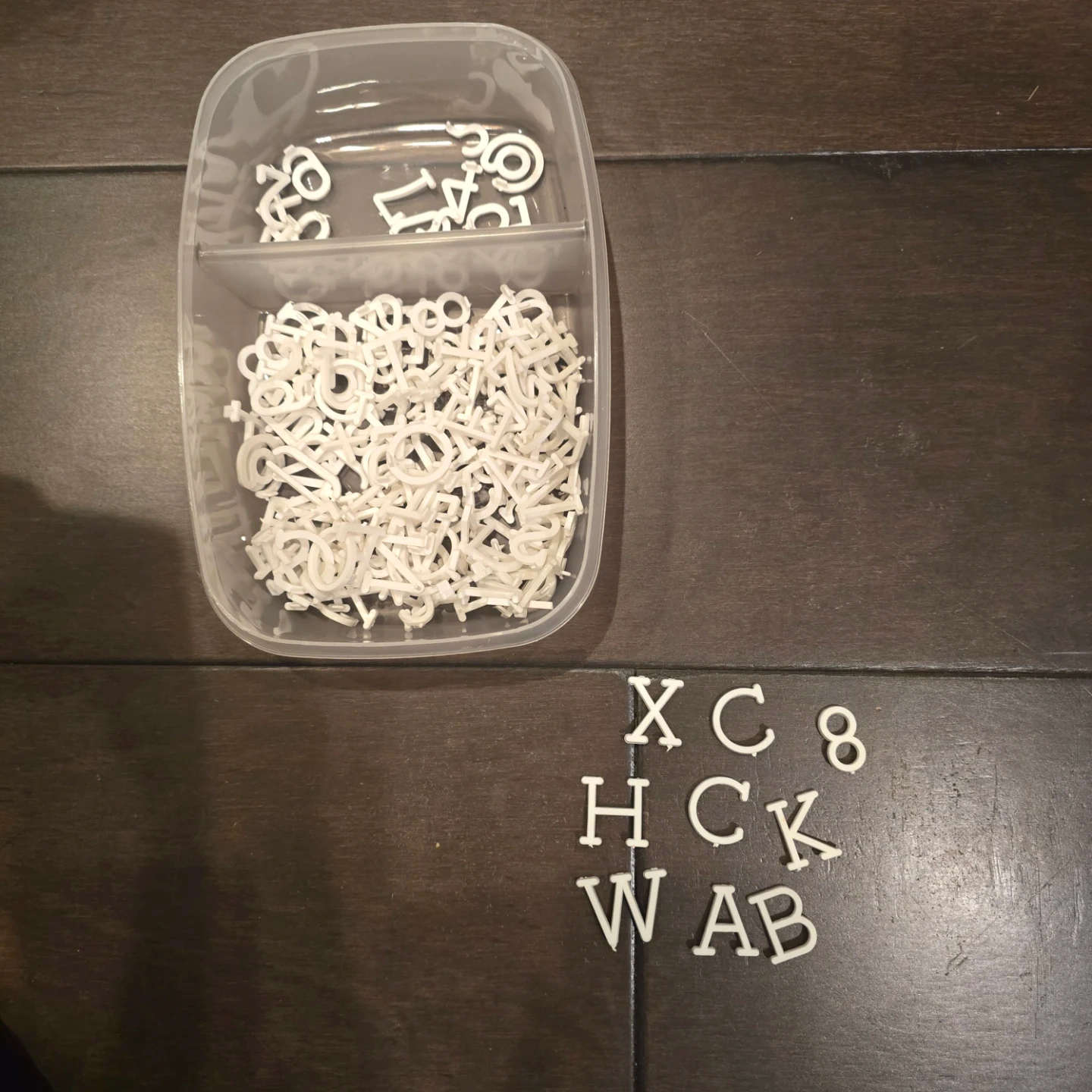 This set includes a variety of white plastic letters and numbers for crafting or decoration. They come in a divided plastic container for storage. Great for personalizing projects!