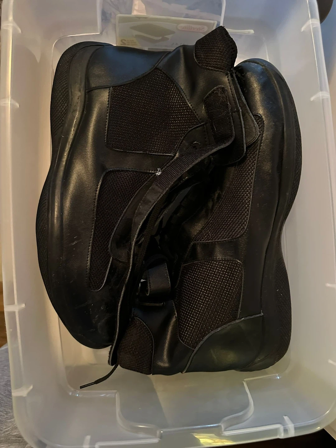 These black Prada high-top sneakers are made with a combination of leather and mesh. They feature adjustable straps for a secure fit. Great for casual wear.