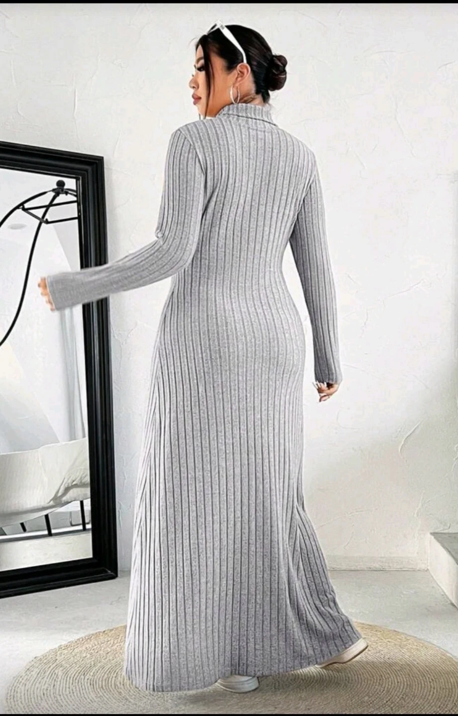 A ribbed knit maxi dress with a turtleneck and long sleeves. It's made of a soft, stretchy fabric.