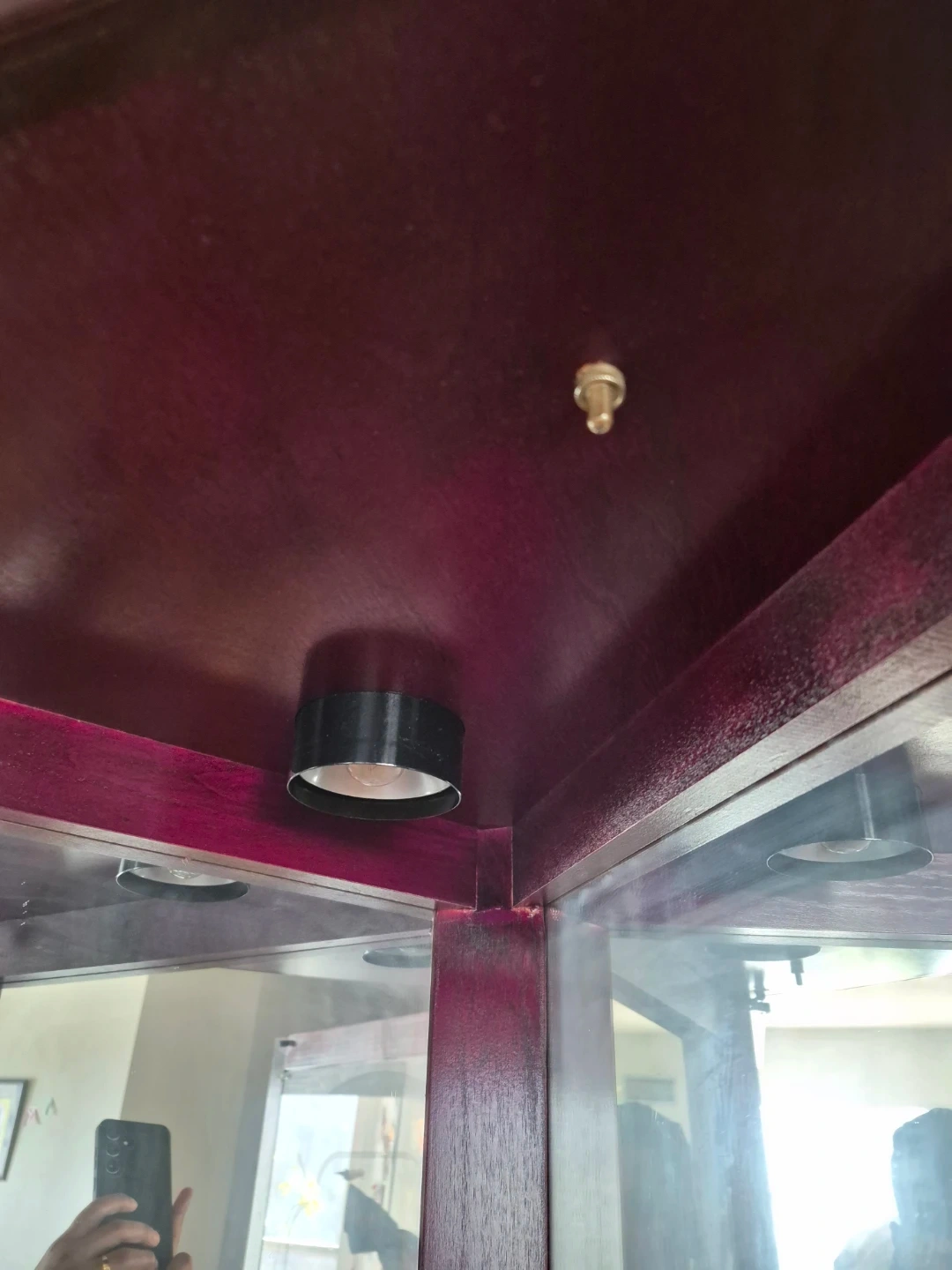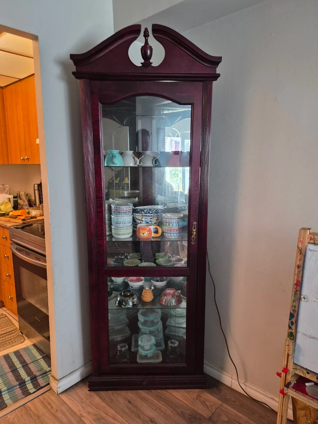 This cherry-coloured corner display cabinet features glass doors and interior lighting. It offers ample shelving(4 selves) for showcasing dishes or collectibles. A great piece for a dining room or living area!