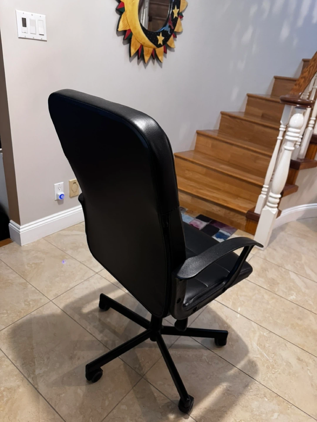 This is a black office chair with faux leather upholstery. It features a padded seat and backrest with a five-star base and casters for easy mobility. The arms are fixed.